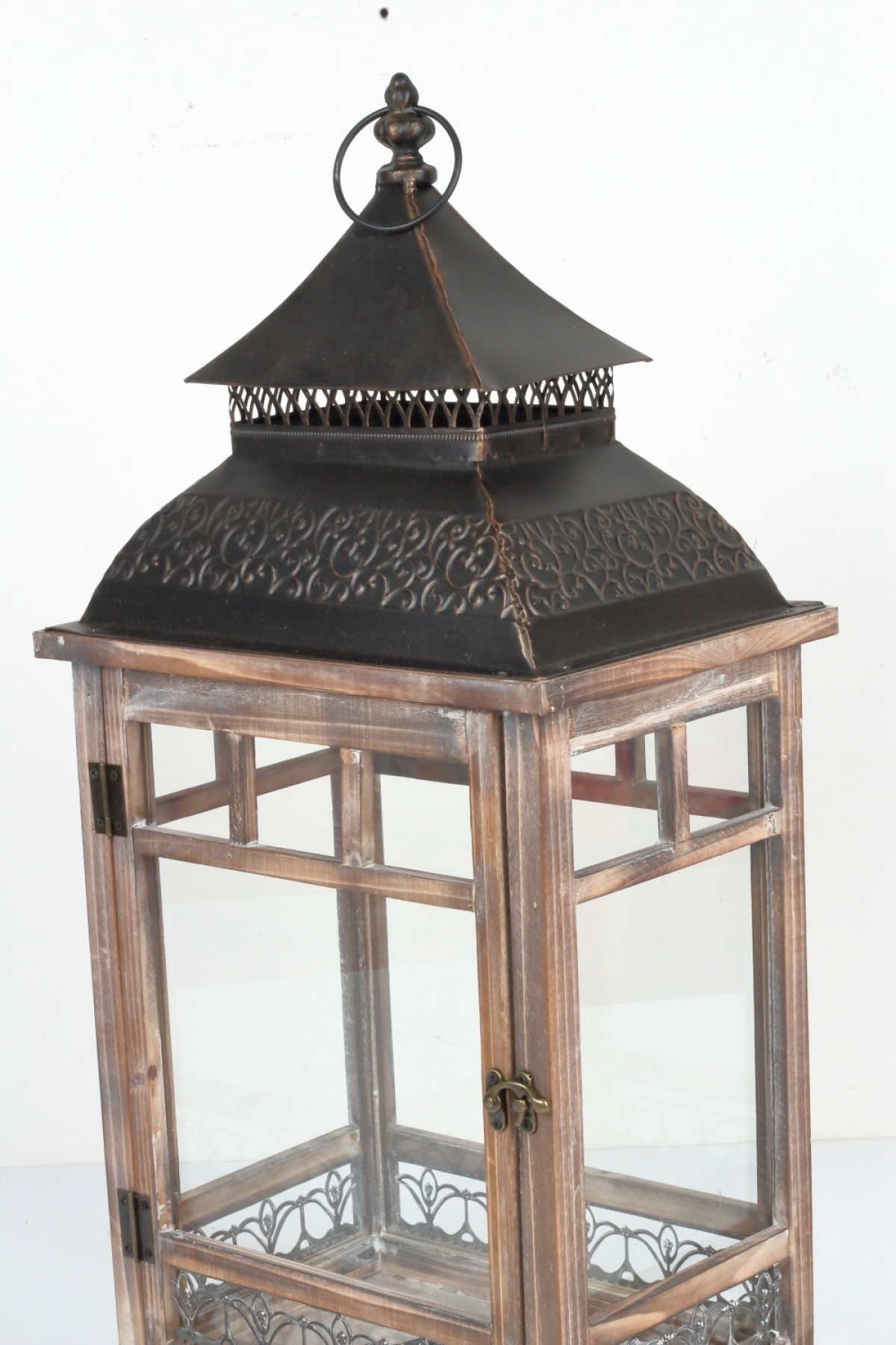 Drevená lucerna tmavo hnedá s kovovou strieškou 66cm pre večerné chvíle pohody, s pohárom vína a zapálených sviečok. Naučte sa odpočívať a užiť si každý okamih!