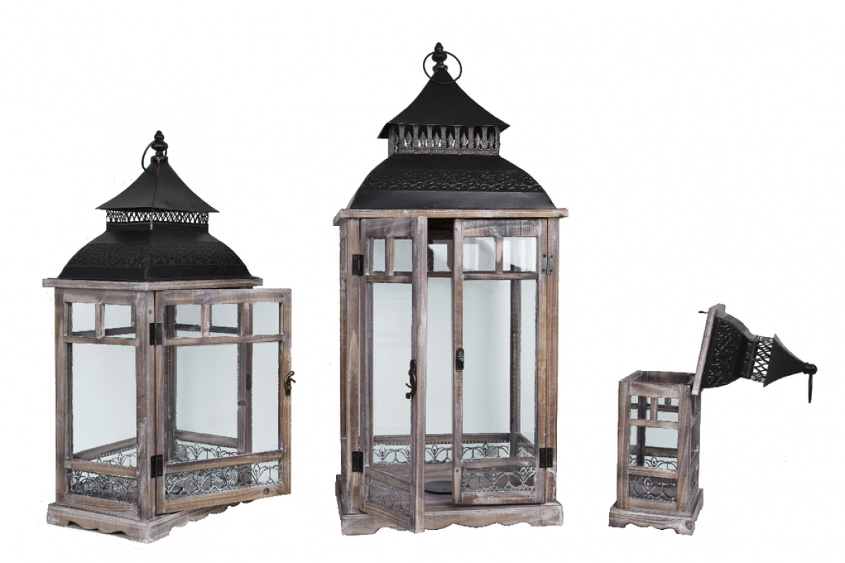 Táto lampáš má kovovú striešku, drevo v hnedej farbe s patinou a je zo sady 3ks (46/66 / 86cm).