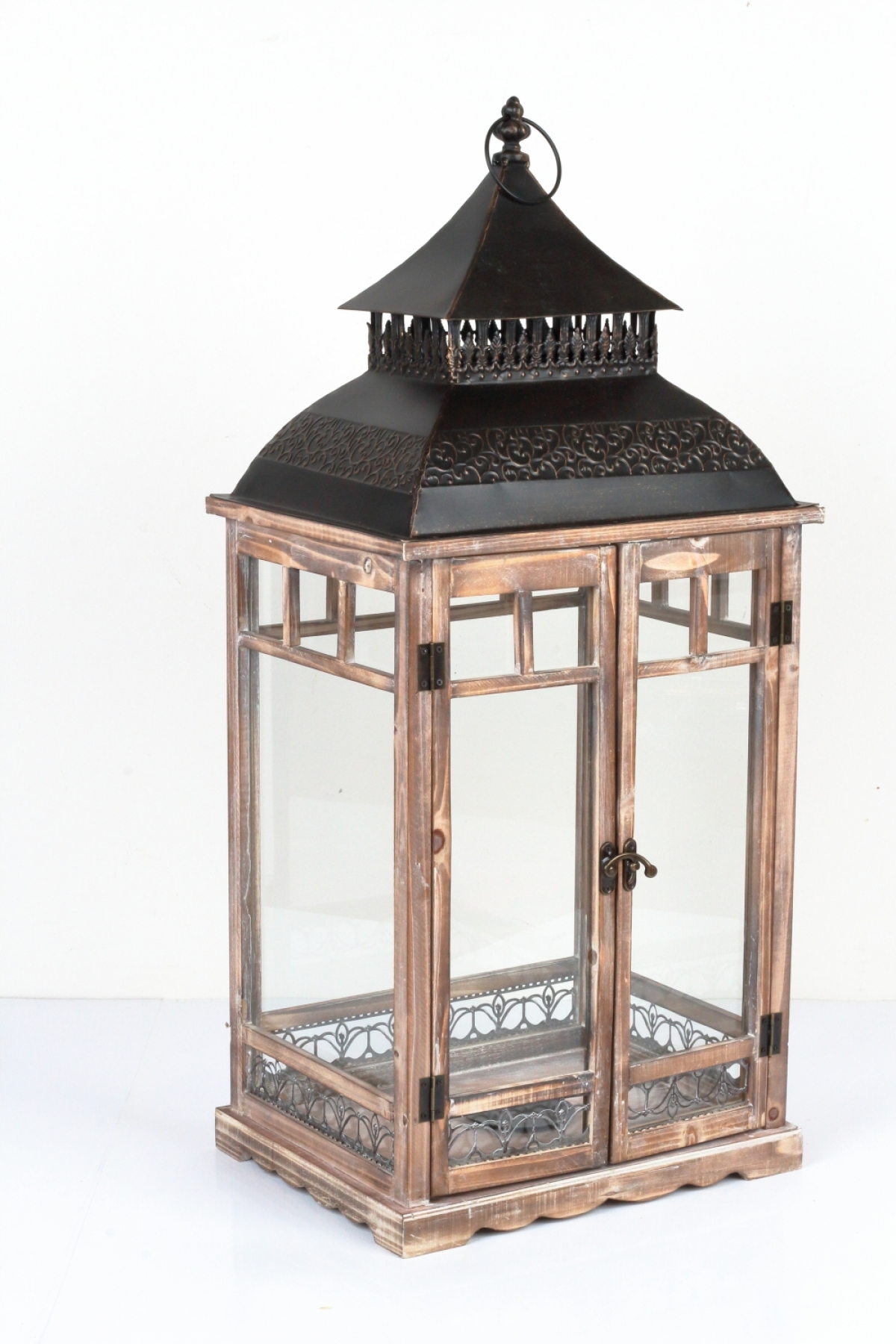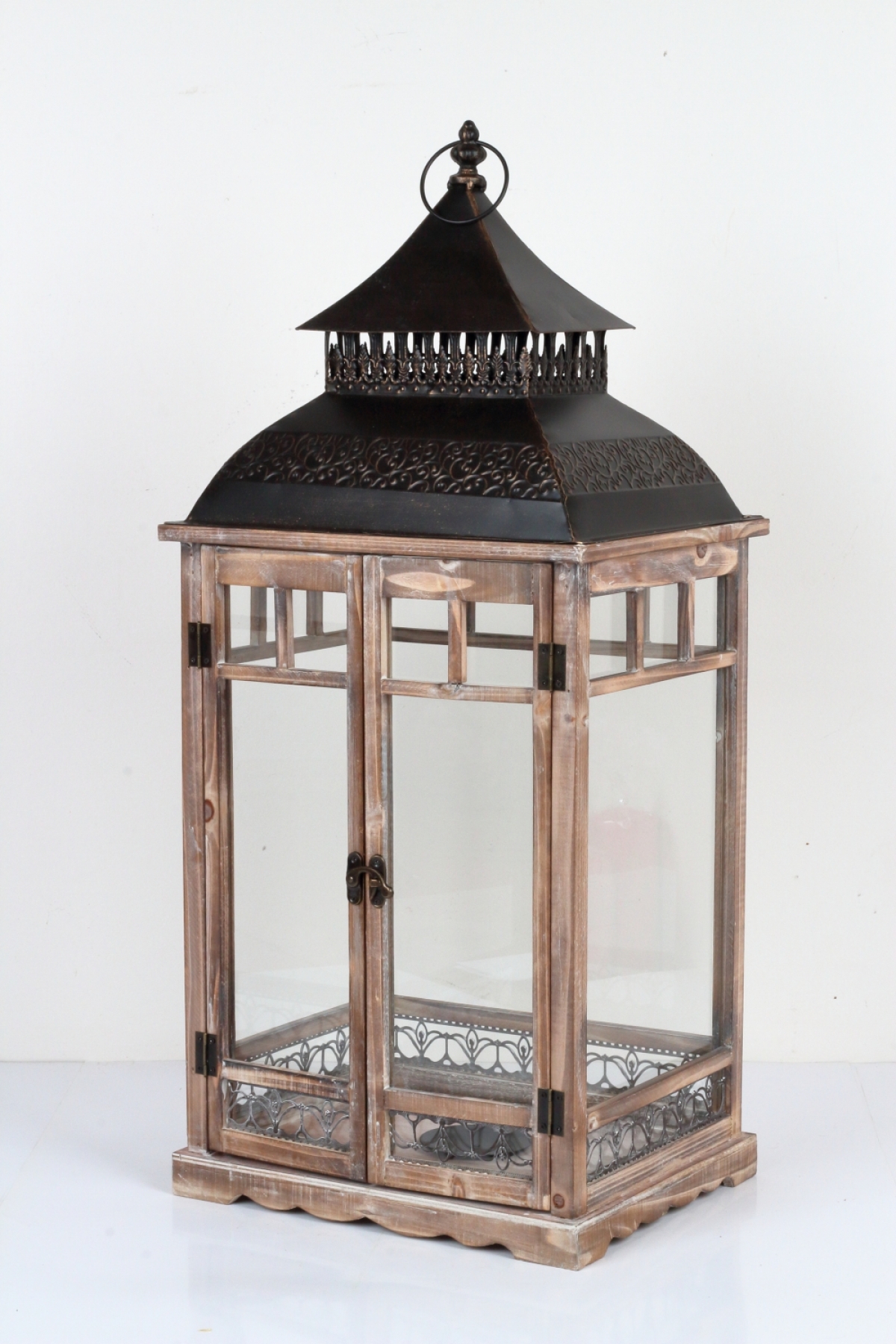 Drevená lucerna tmavo hnedá s kovovou strieškou 86cm pre večerné chvíle pohody, s pohárom vína a zapálených sviečok. Naučte sa odpočívať a užiť si každý okamih!