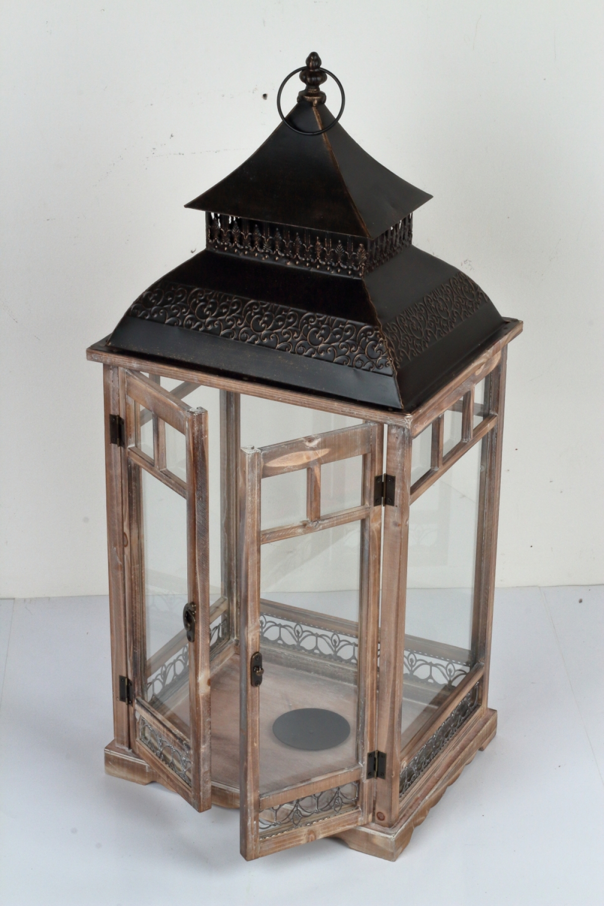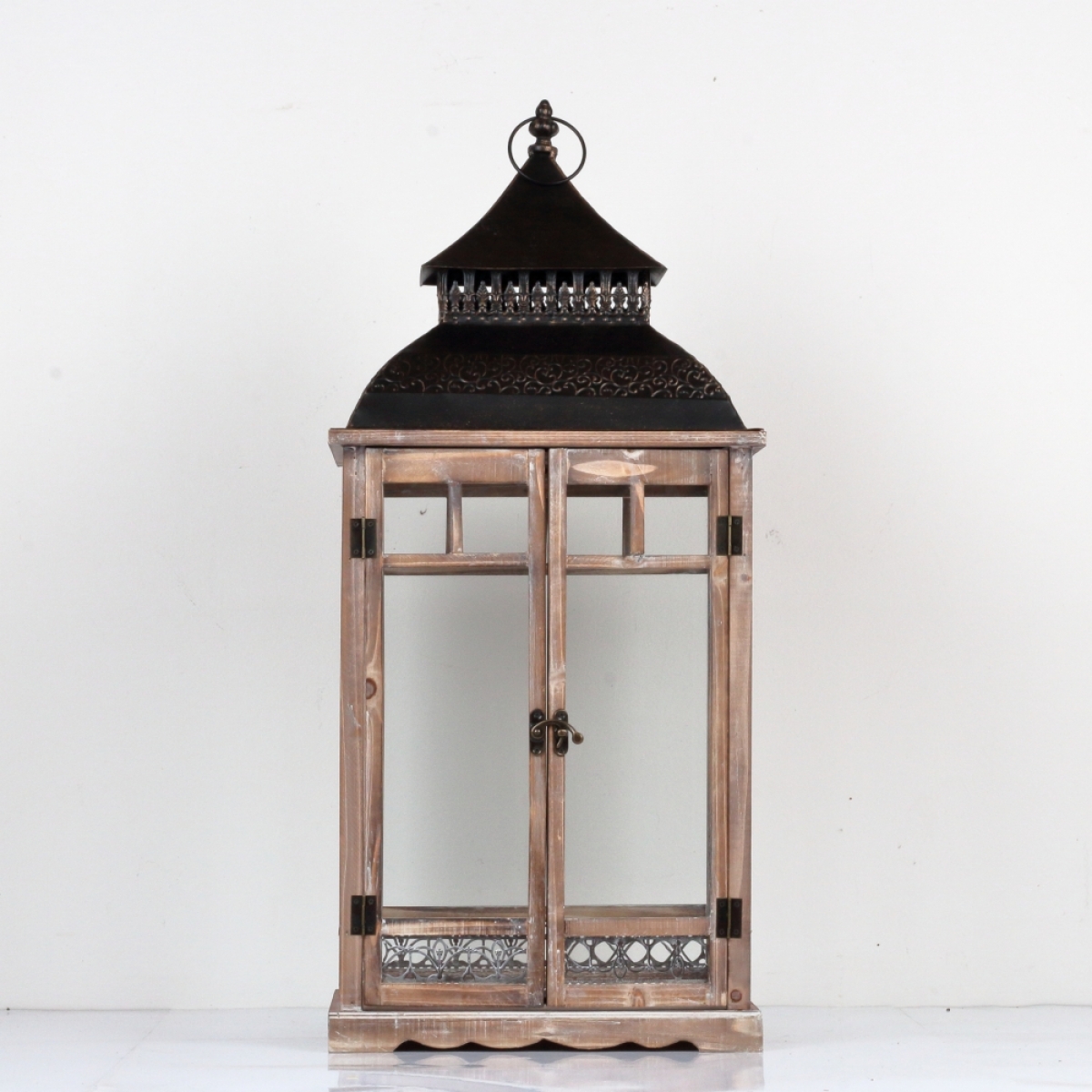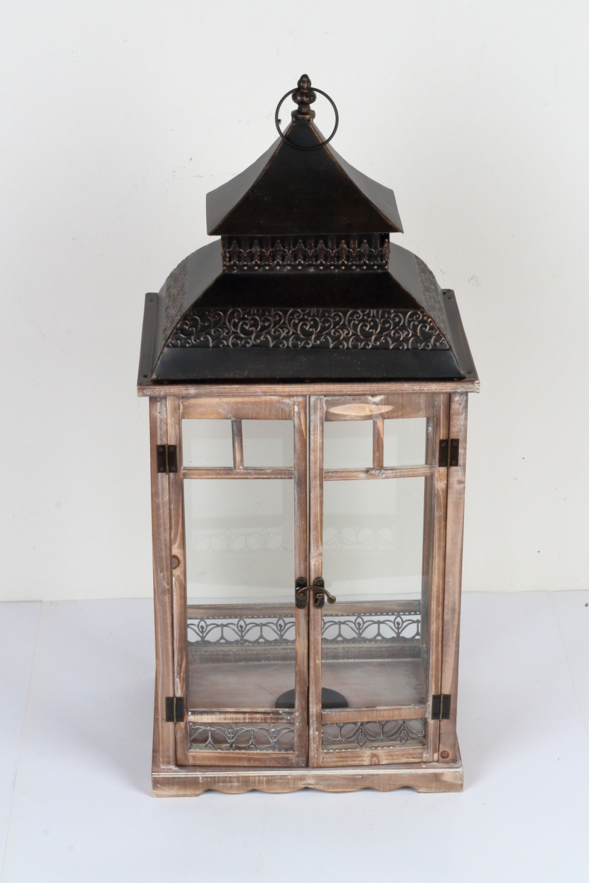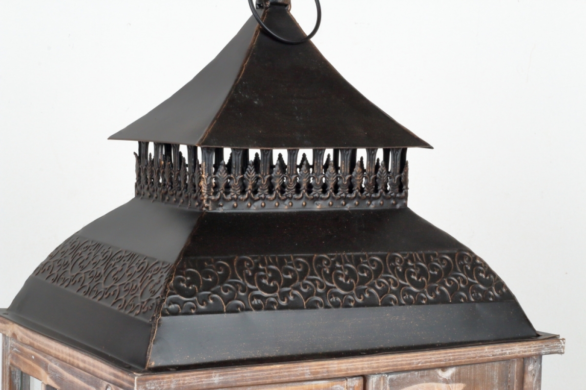 Drevená lucerna tmavo hnedá s kovovou strieškou 86cm