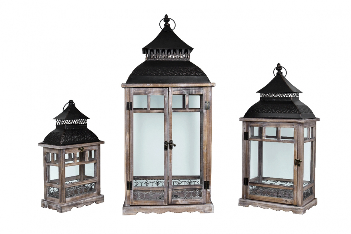Táto lampáš má kovovú striešku, drevo v hnedej farbe s patinou a je zo sady 3ks (46/66 / 86cm).