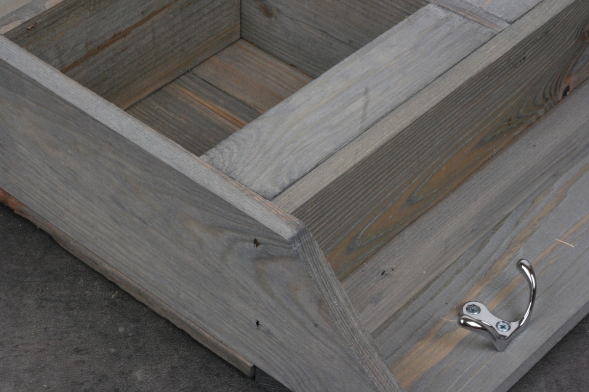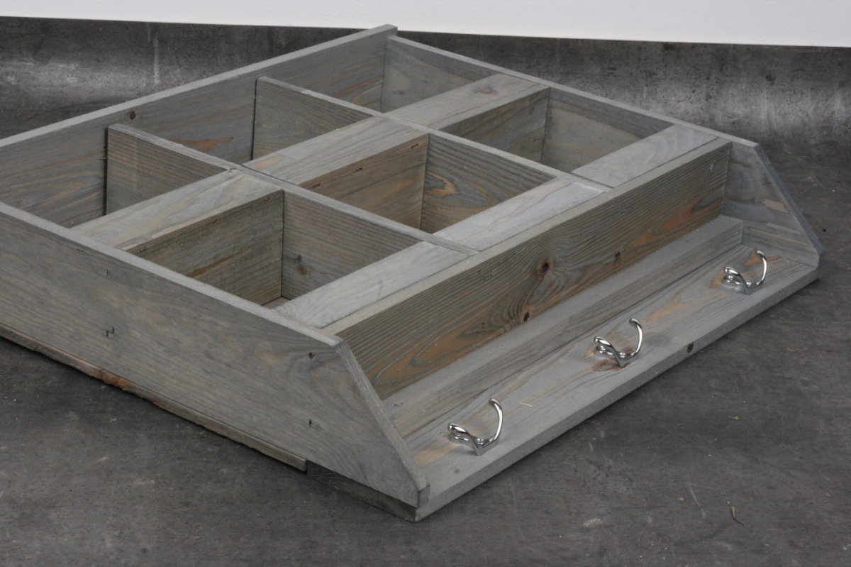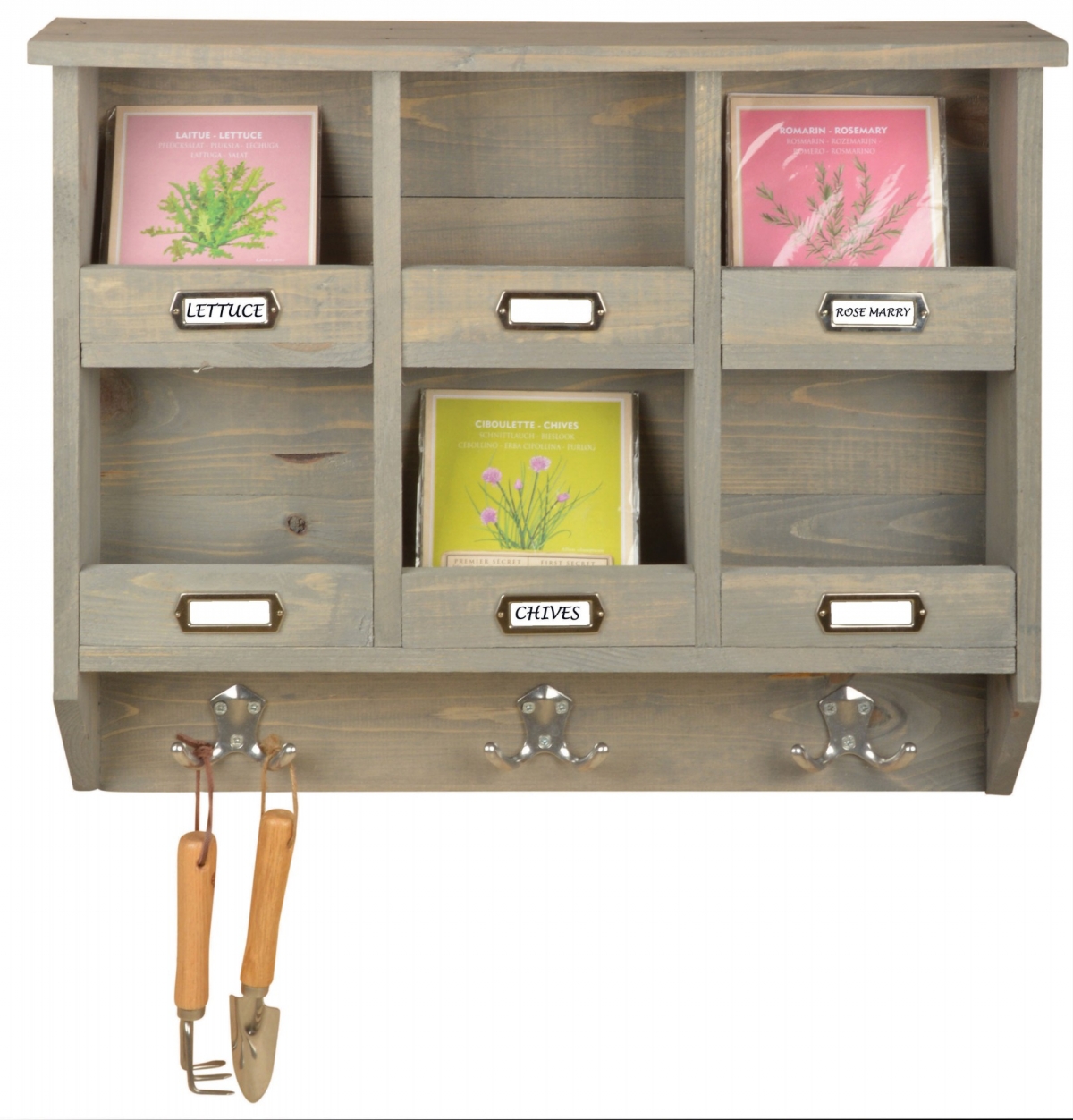 Drevená nástenná polica - organizér 57,3x11,0x47,2cm má priehradky napríklad na vrecká so semienkami a šikovné kovové háčiky na záhradné potreby.