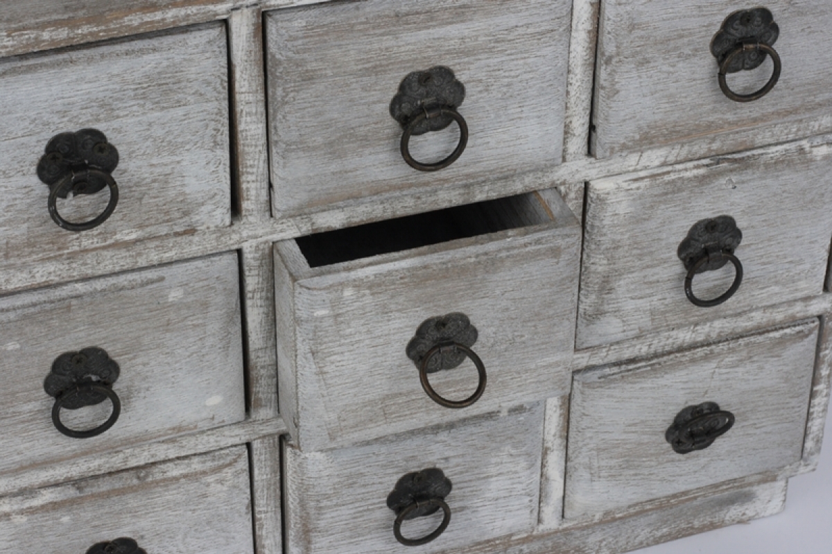 Drevená skrinka 9 šuplíčkov 27x23x10cm môže slúžiť v kuchyni, chodbe i spálni. Či už do nej budete ukladať sáčky s korením, kľúče alebo šperky, vždy bude úžasnú súčasťou každej komody či police.