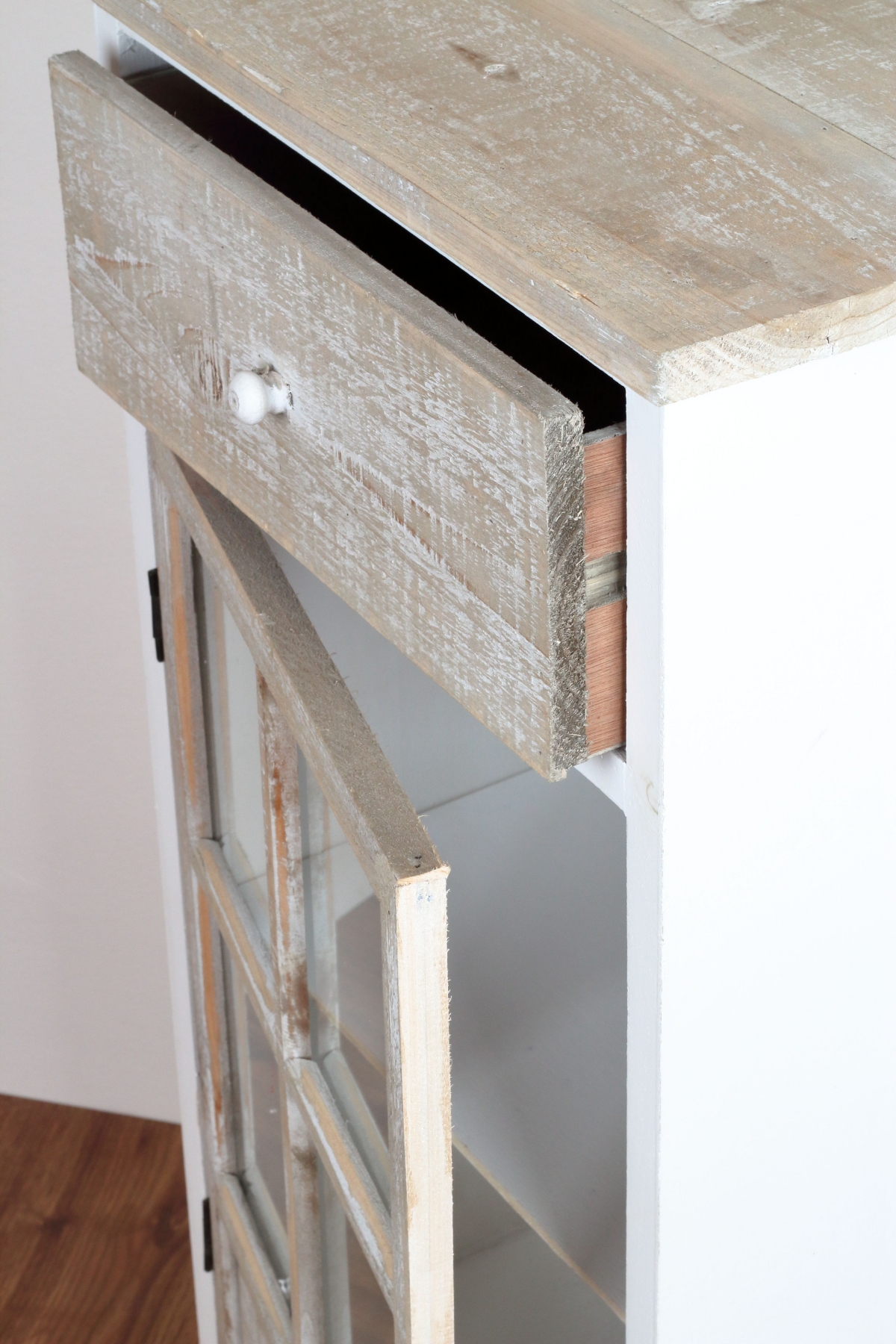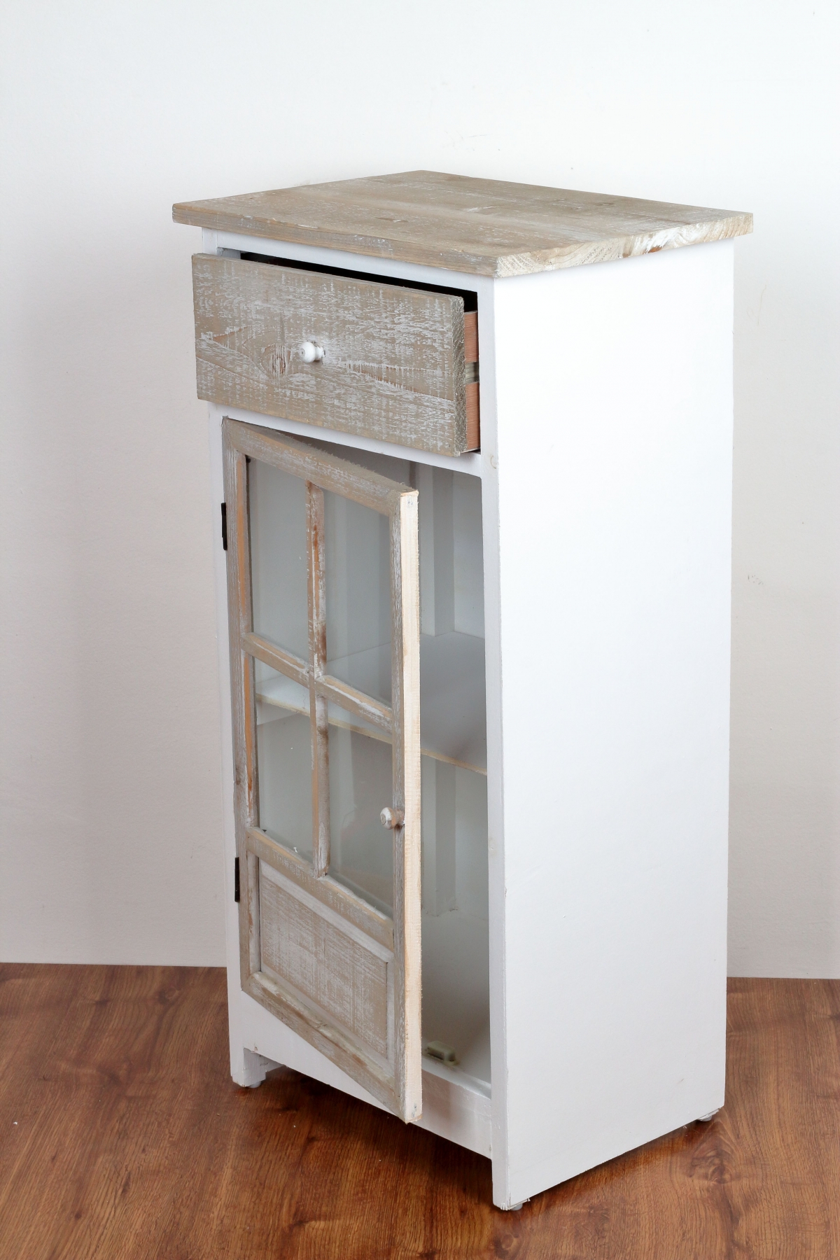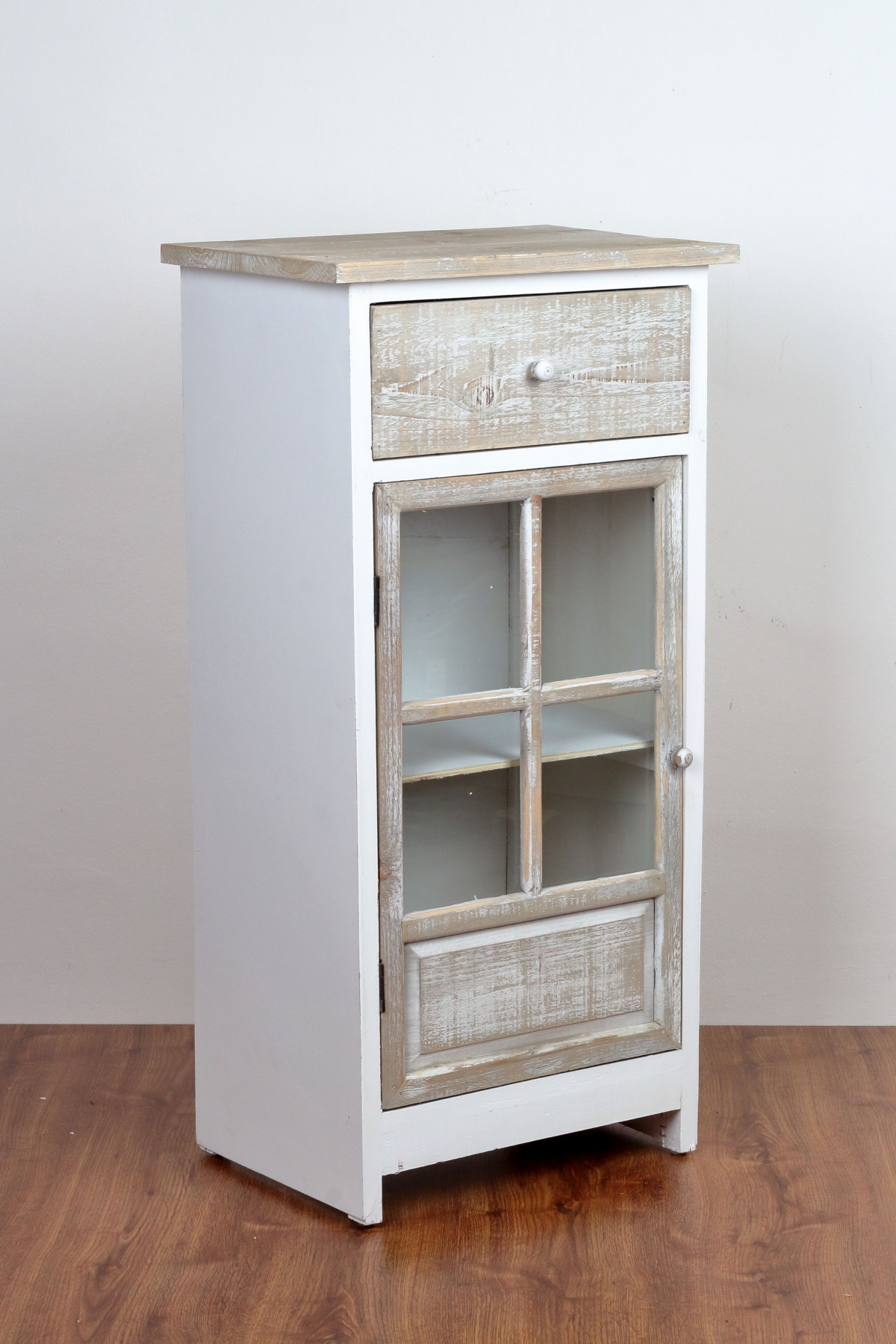 Drevená skrinka presklená s dvoma šuplíkmi 45x90x32cm pripomína ošumelá kus nábytku zo starej pôdy. Presne také kúsky my milujeme! Majú totiž svoje jedinečné čaro strých časov.
