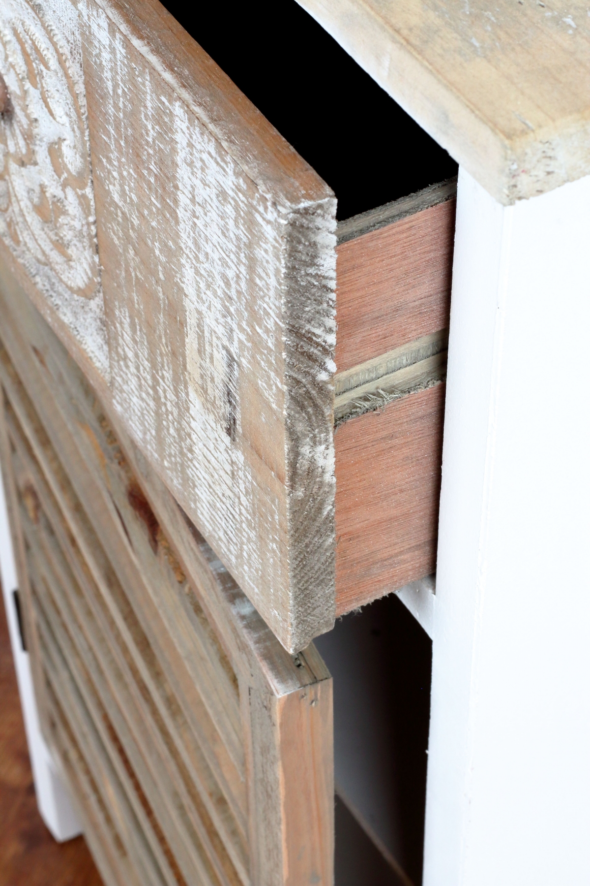 Spodná dvierka pripomínajú starú drevenú obločnicu, šuplík má ľahkú patinu a ornament okolo úchytky. Prírodné drevo s bielym náterom spolu krásne ladí, patina dodáva celému nábytku patričný šmrnc.