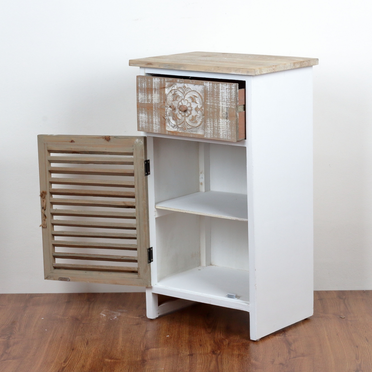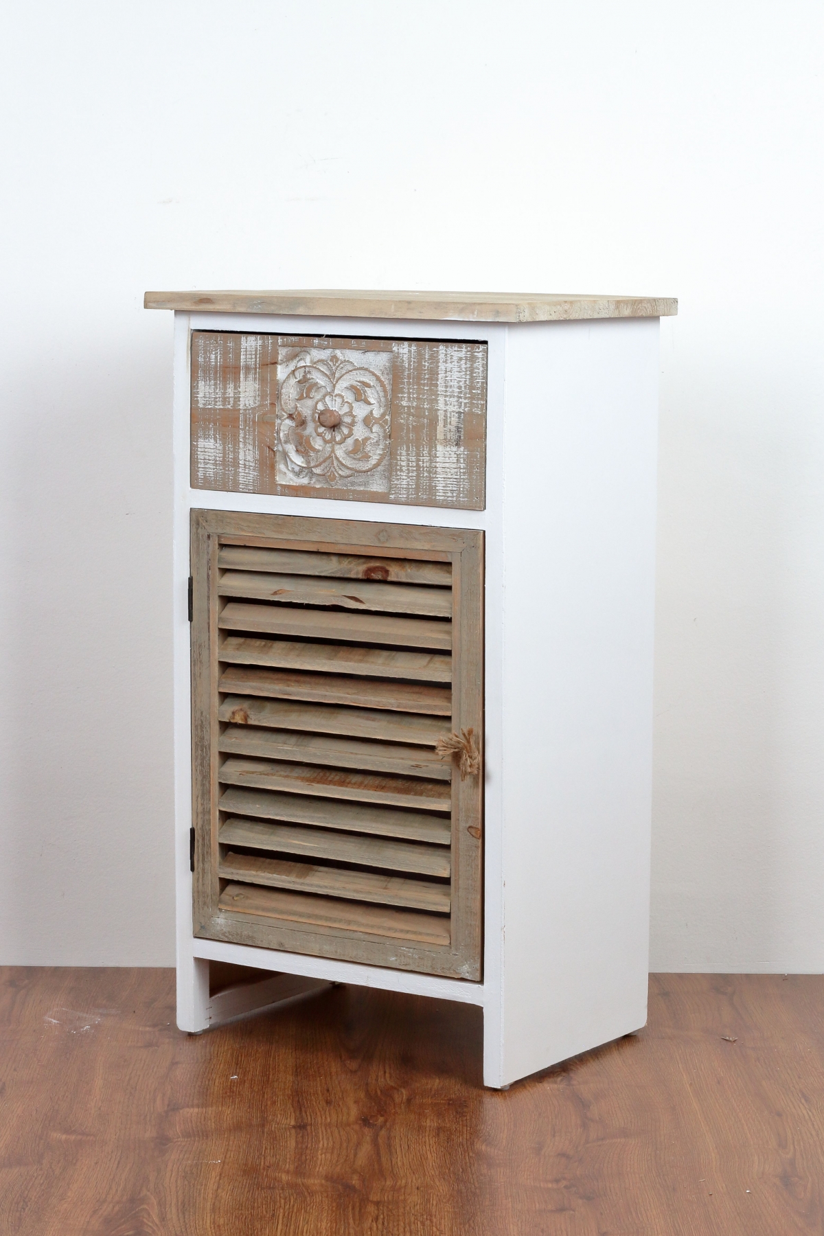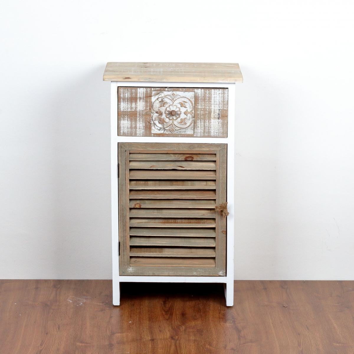 Drevená skrinka s zásuvkou s ornamentom 45x78x32cm dýcha eleganciou a pokojom vidieckeho štýlu bývania. Zamilujete sa na prvý pohľad!