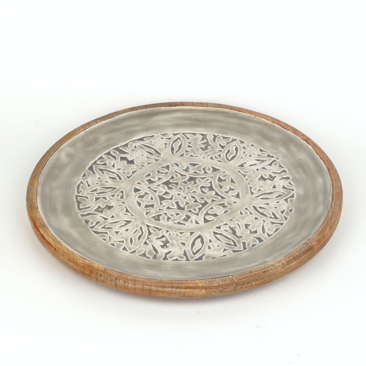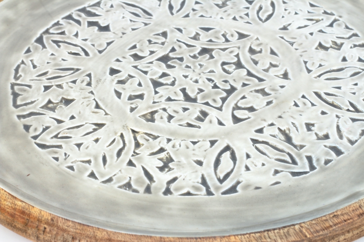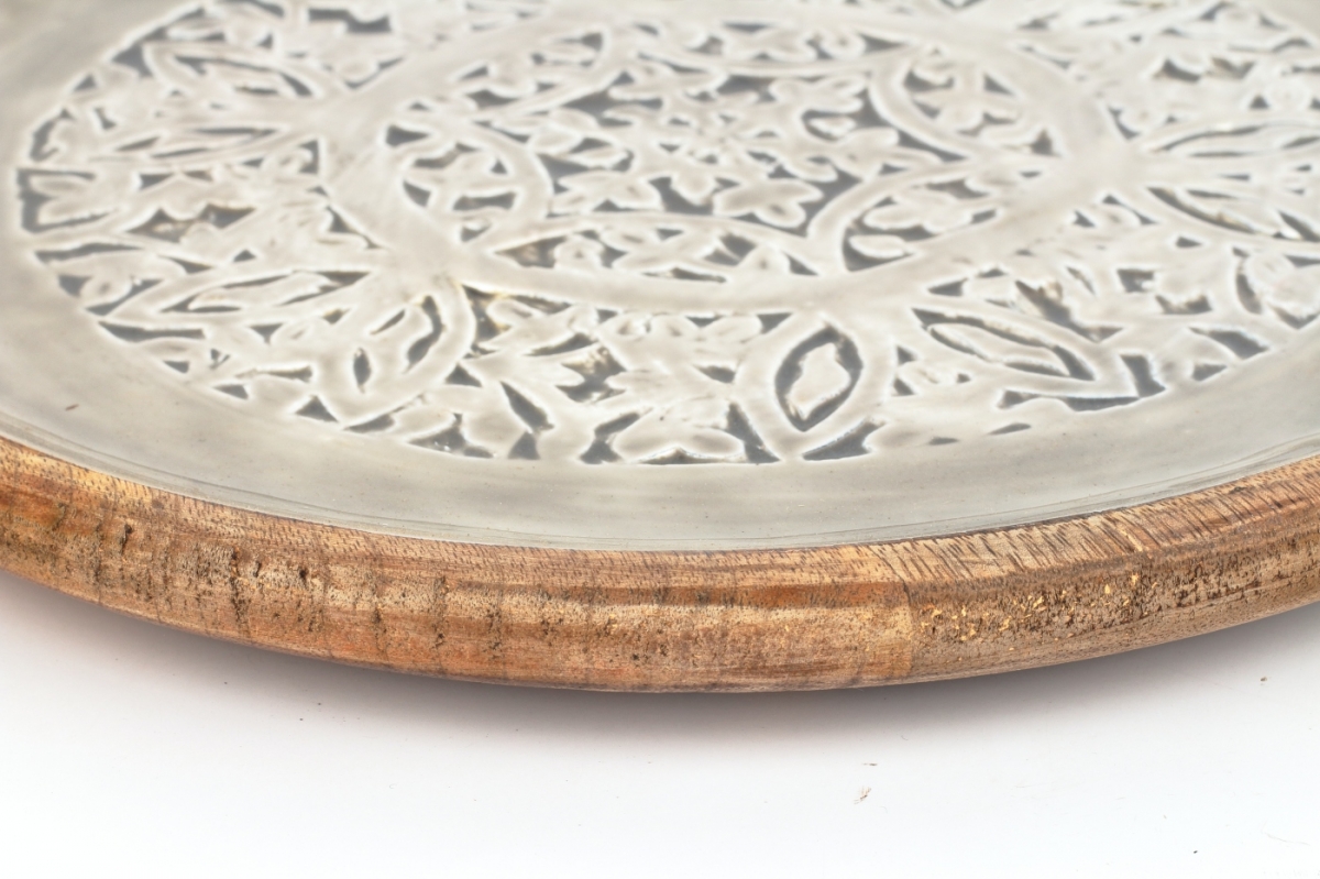 Drevená tácka má technikou gravírovania vytvorený krásny, orientálny ornament, ktorý je zvýraznený lakovaním.