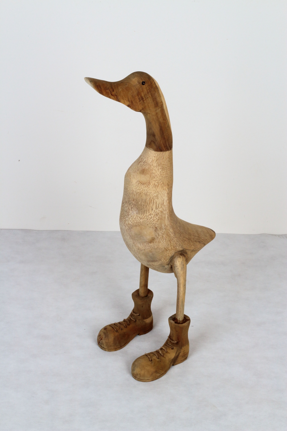 Drevená kačica je ručne vyrobená z tropického dreva. V ponuke ju nájdete v troch rôznych veľkostiach a niekoľkých typoch povrchových úprav (v prírodnej neošetrenej verzii, lakované, alebo strapaté). Táto je v prírodnej neošetrené verzii.