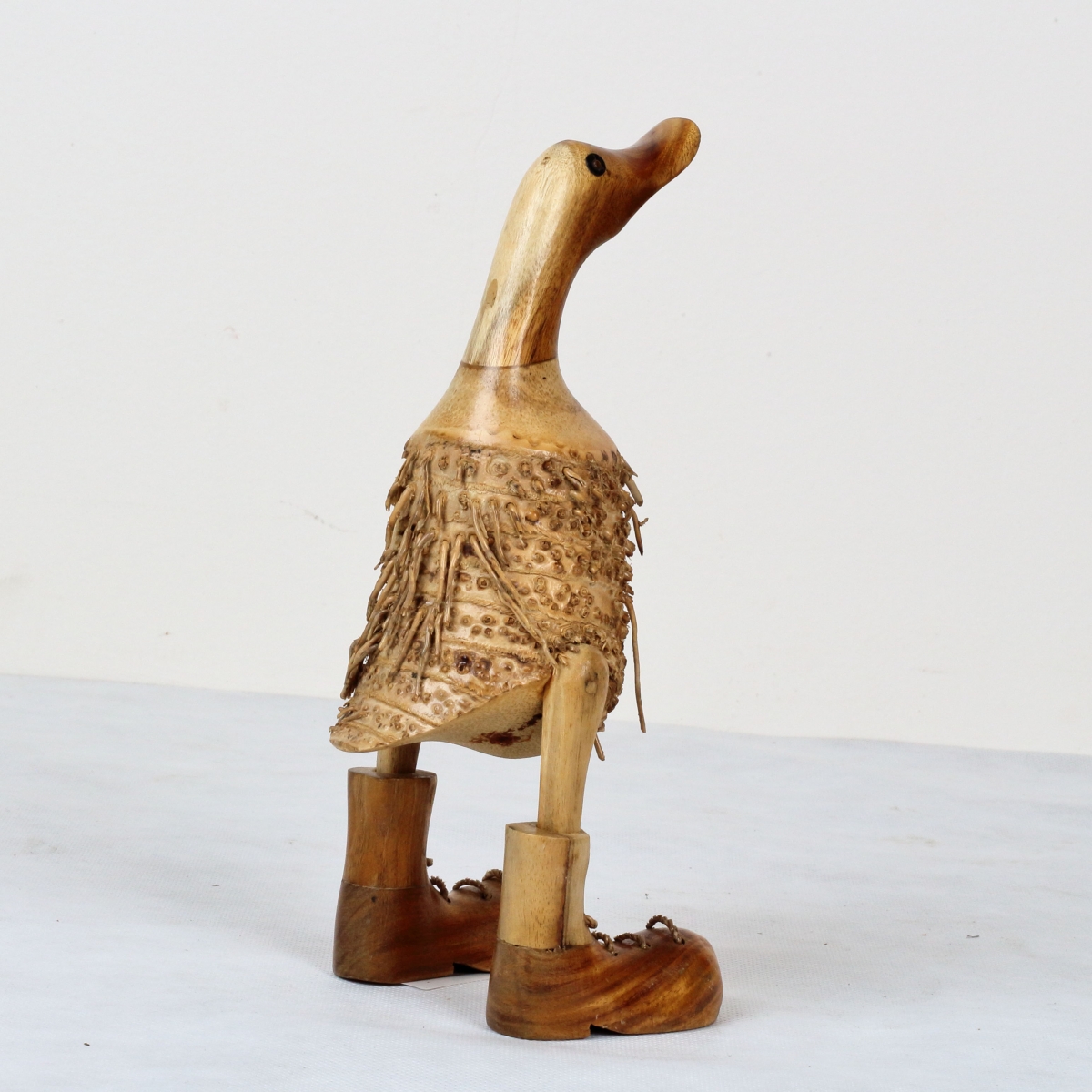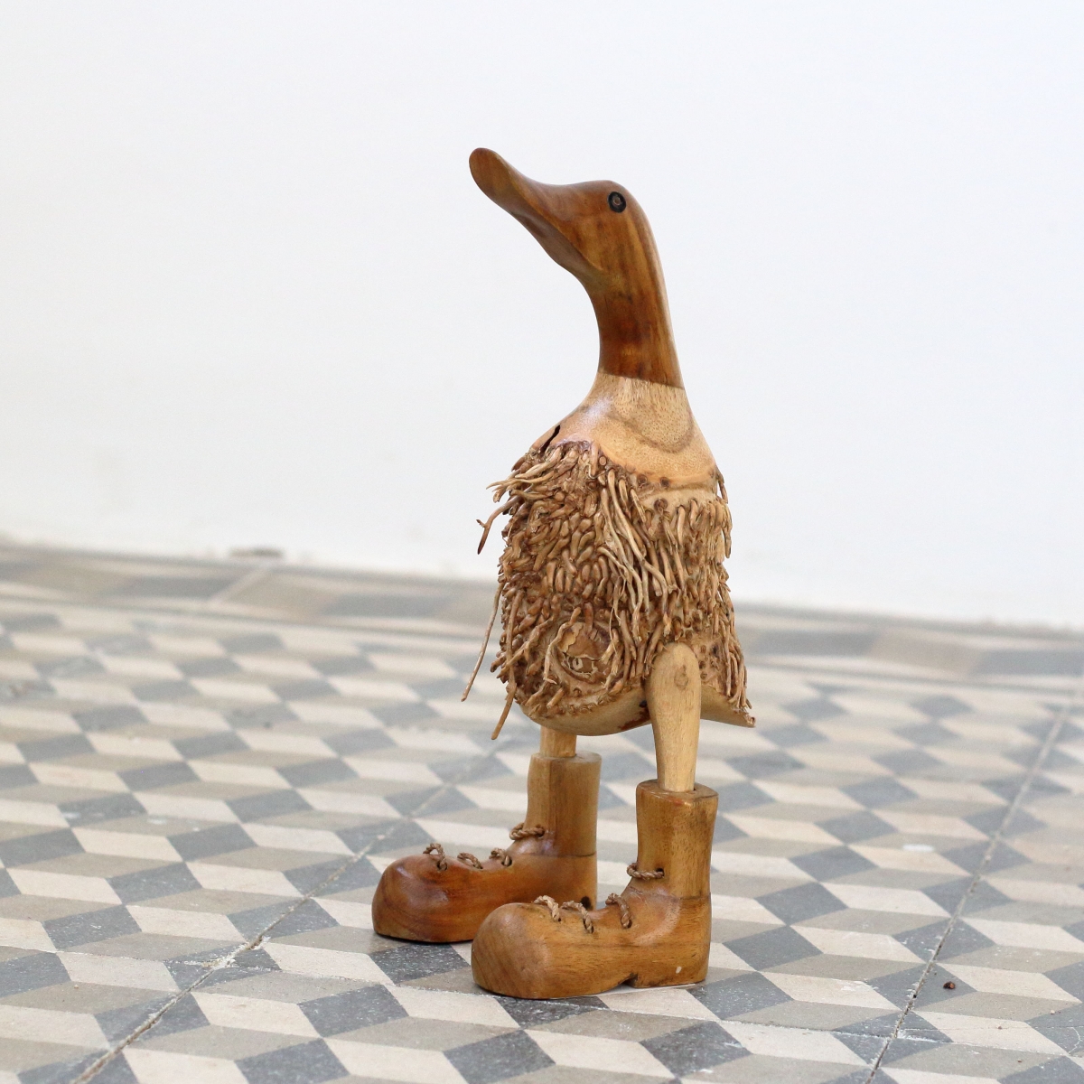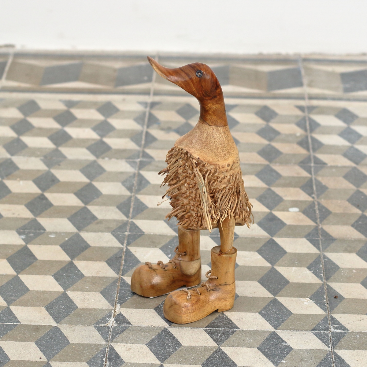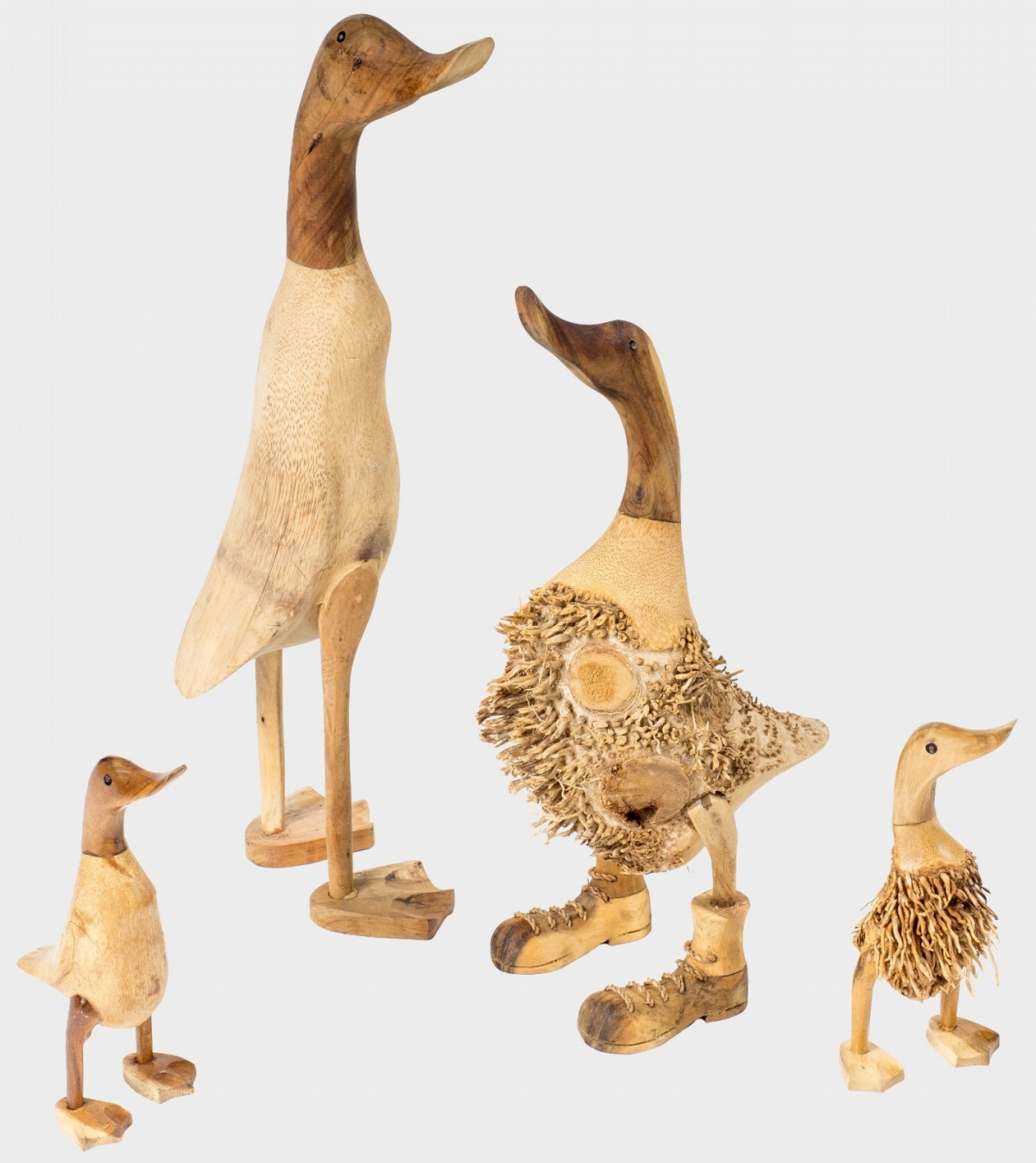 Drevená kačica je ručne vyrobená z tropického dreva. V ponuke ju nájdete v troch rôznych veľkostiach a niekoľkých typoch povrchových úprav (v prírodnej neošetrenej verzii, lakované, alebo strapaté).