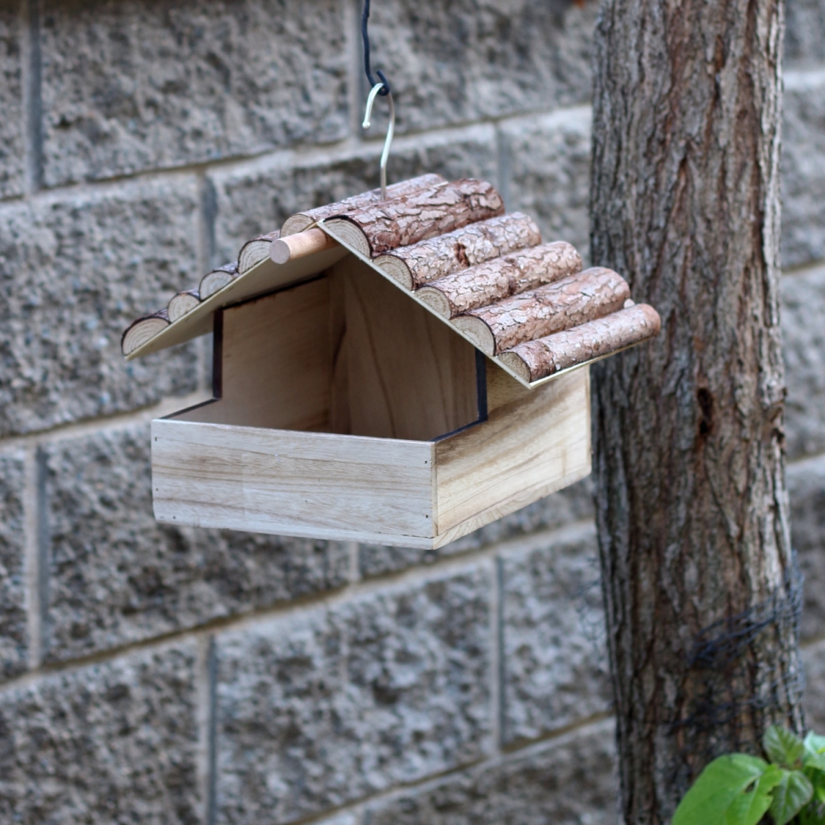 Drevené kŕmidlo pre vtáky na zavesenie
