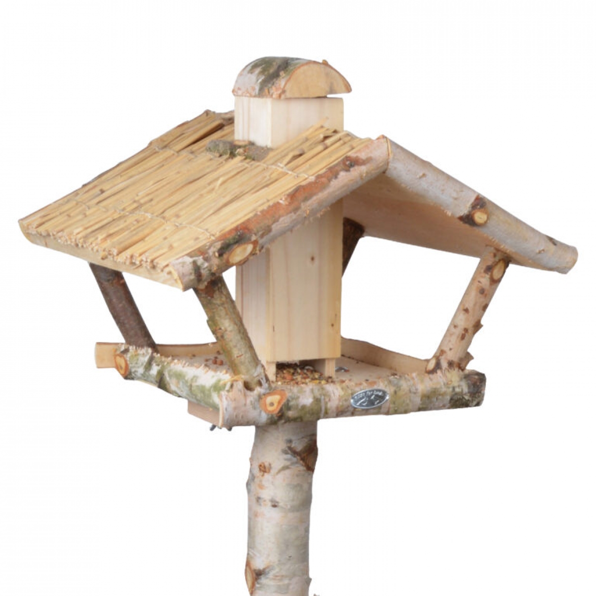 Drevené krmítko pre vtáčiky je vyrobené z drevených špalíkov brezového a jedľového dreva pre zachovanie prírodného dizajnu, so strieškou pokrytou sušeným trstinou.