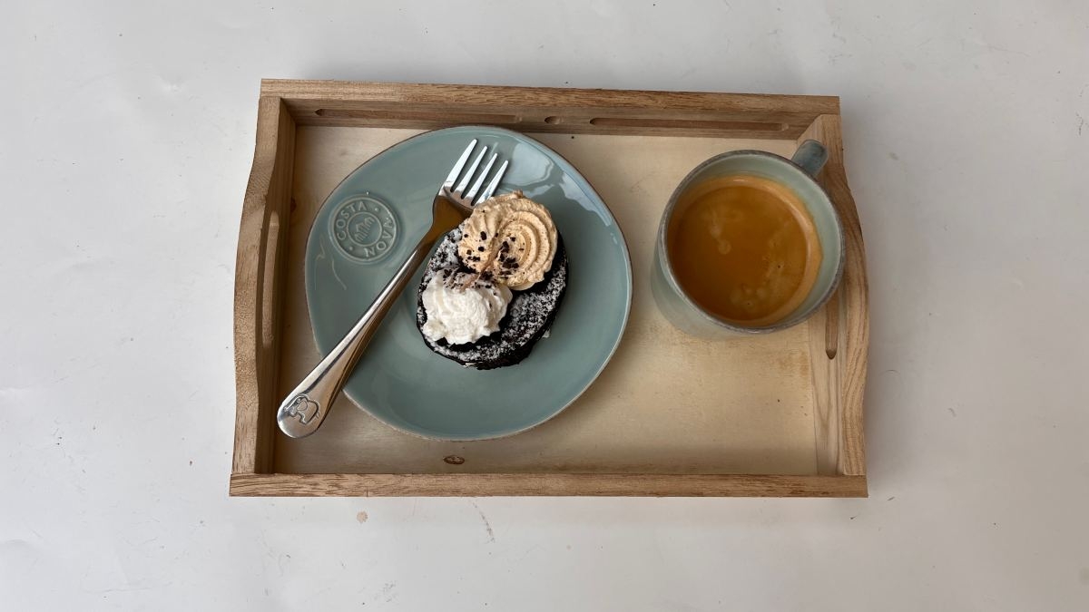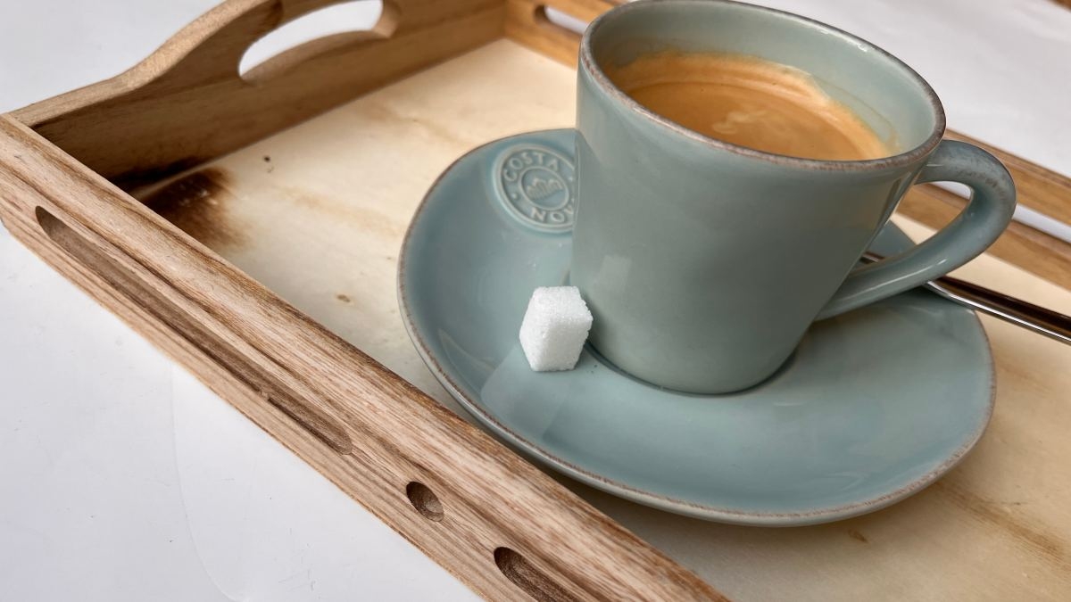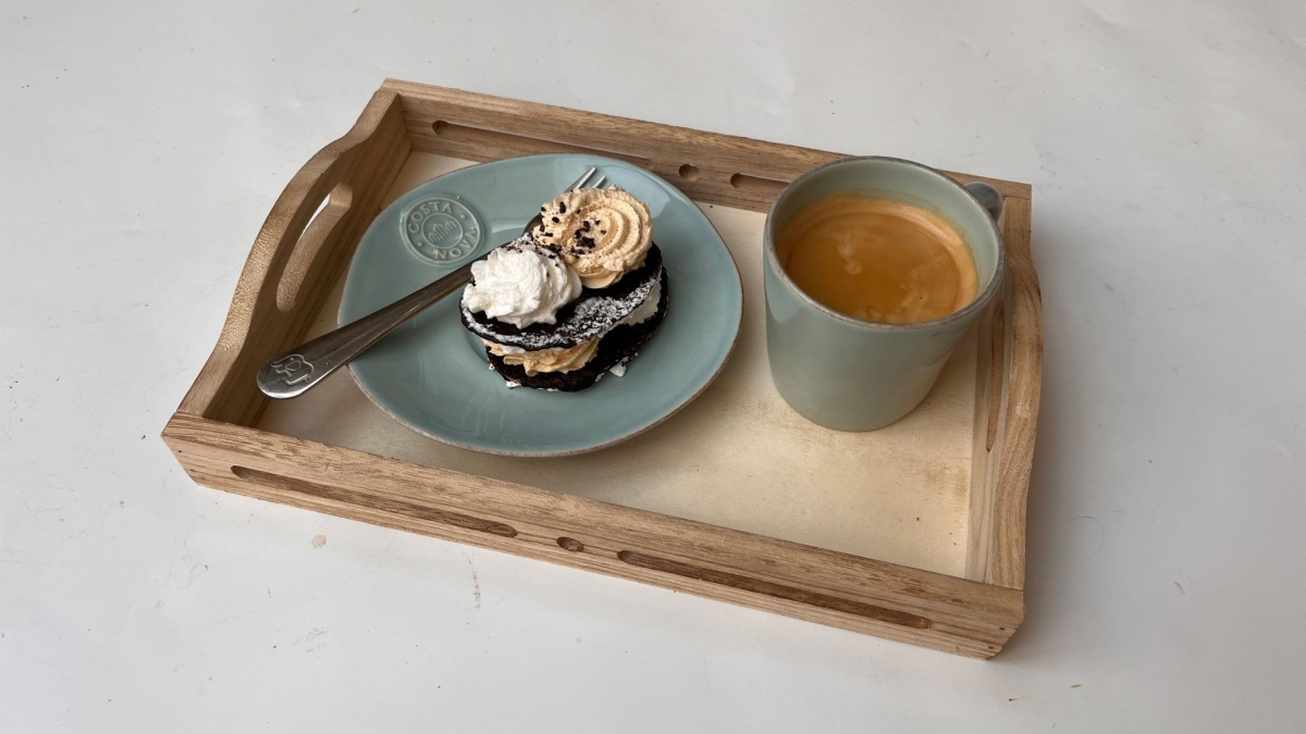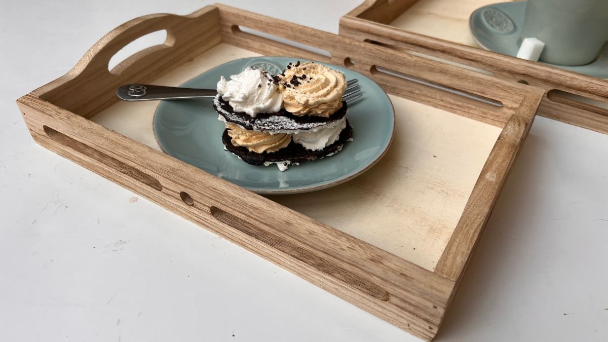 Drevený podnos obdĺžnikový môže slúžiť aj ako štýlová dekorácia. Menšia tácka je vložená v priestore veľkého.