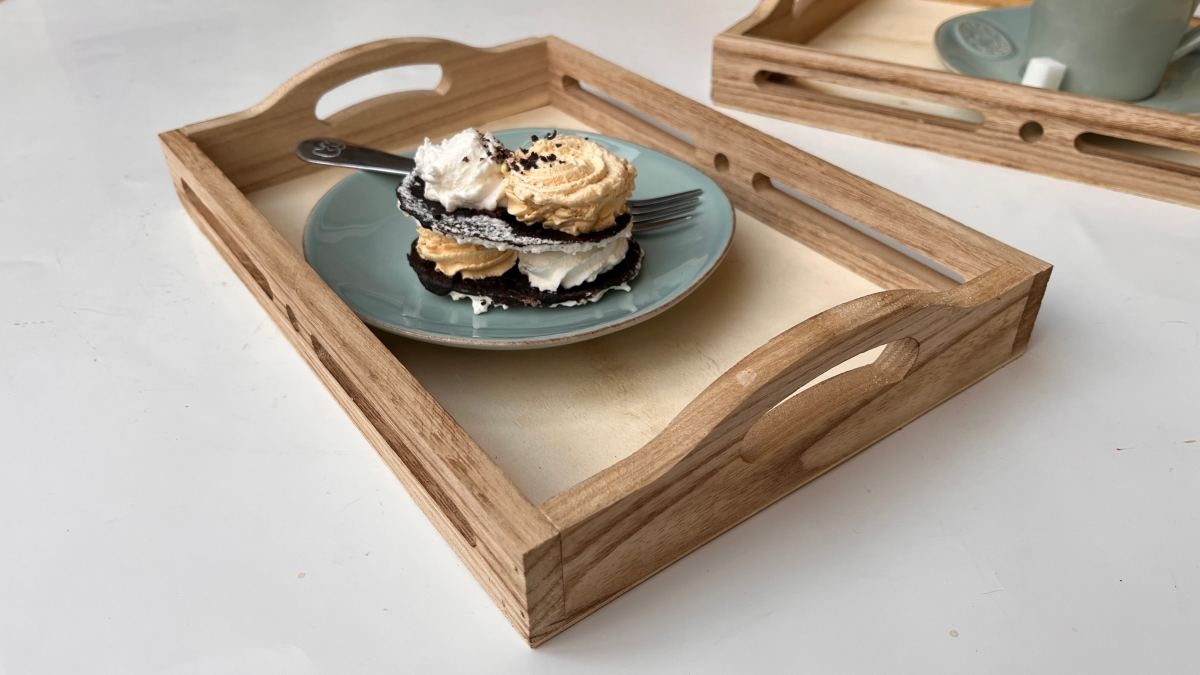 Drevený podnos s úchytmi, v sade dvoch kusov, na servírovanie raňajok do postele, prenášanie kávy na návštevy, alebo na jednoduchšie prenesenie príborov a doplnkov na záhradu pri večernom grilovaní.