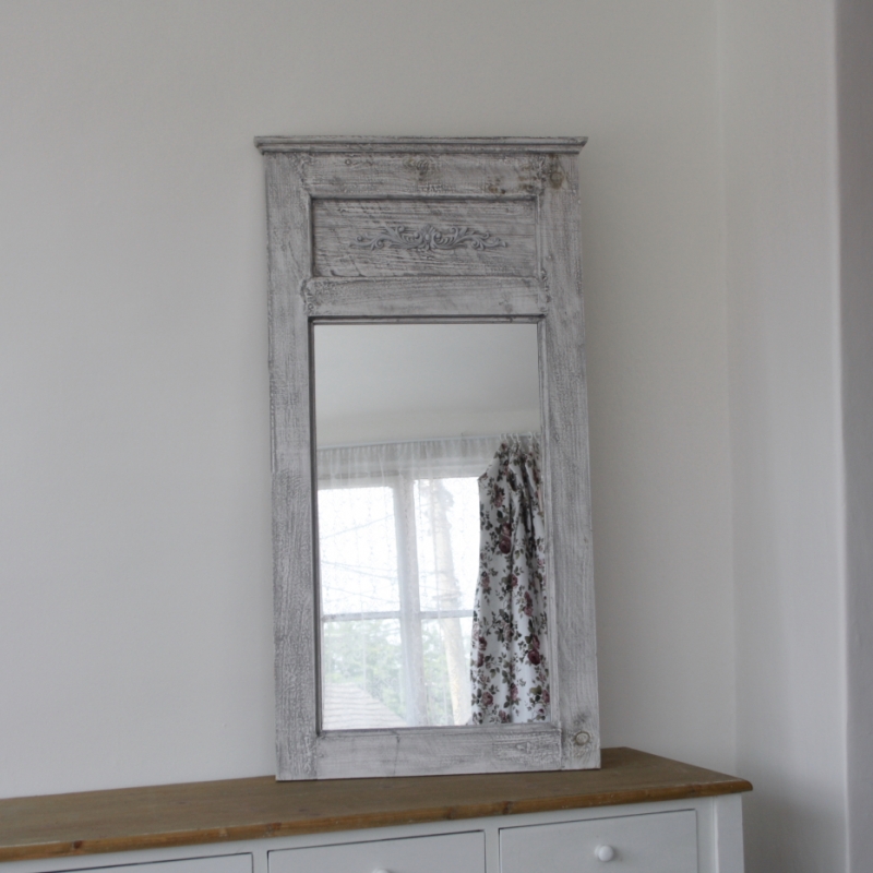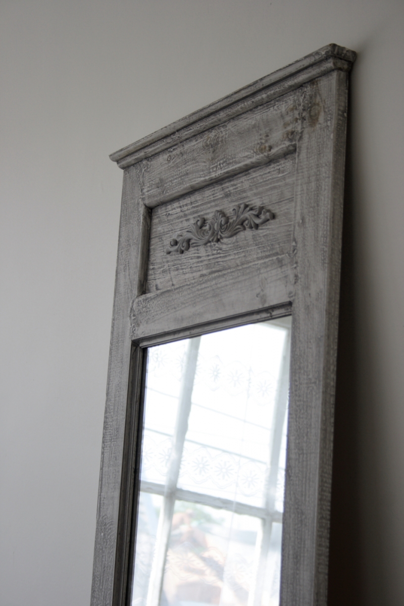 Drevené sivé zrkadlo s patinou a ornamentom 121cm