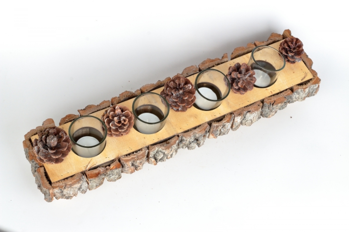 Drevená podesta adventného svietnika s kôrou je zdobená borovicovými šiškami. Sviečky Bezpečné umiestnite do sklenených kalíškov.
