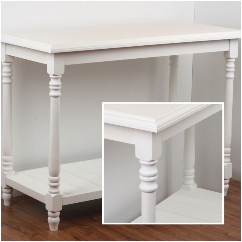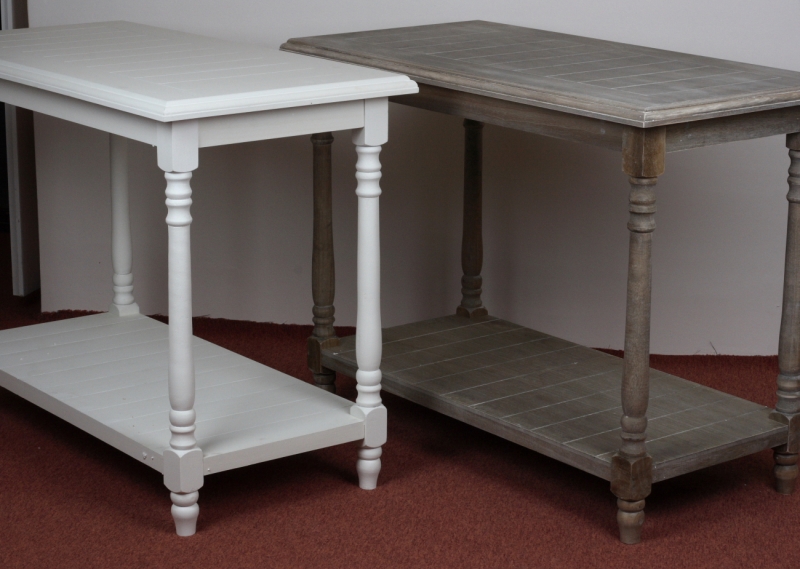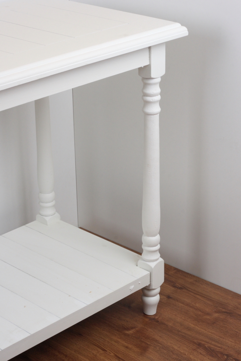 Stolík môže slúžiť ako otvorená komoda pri stene alebo v priestore napríklad ako kuchynský ostrovček. Spodná i horná doska má latkový vzhľad, nohy sú sústružené. Biela farba pôsobí veľmi elegantne a je neutrálny voľbou k existujúcemu nábytku.