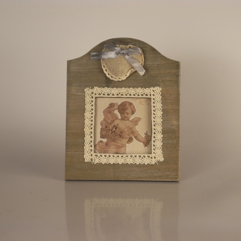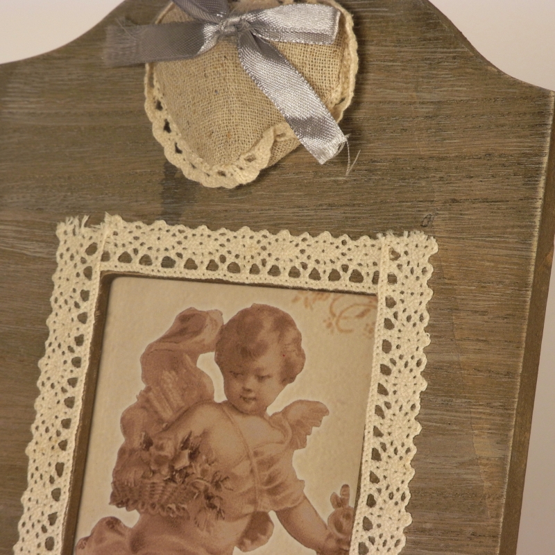 K jeho zhotovenie bolo použité drevo, ktoré má ponechaný prírodný vzhľad. Fotorámik je ozdobený čipkou a bavlneným vrecúškom s mašľou v hornej časti.