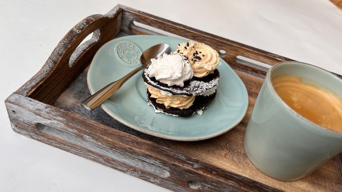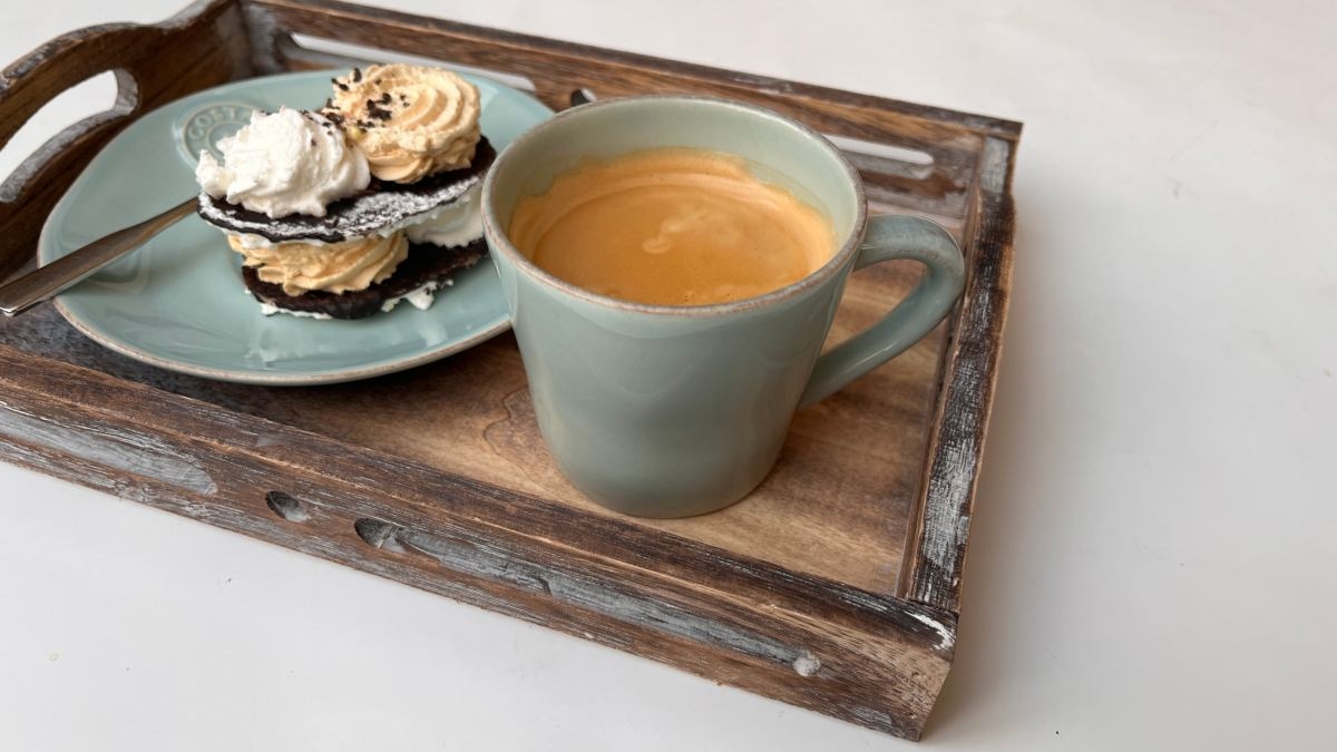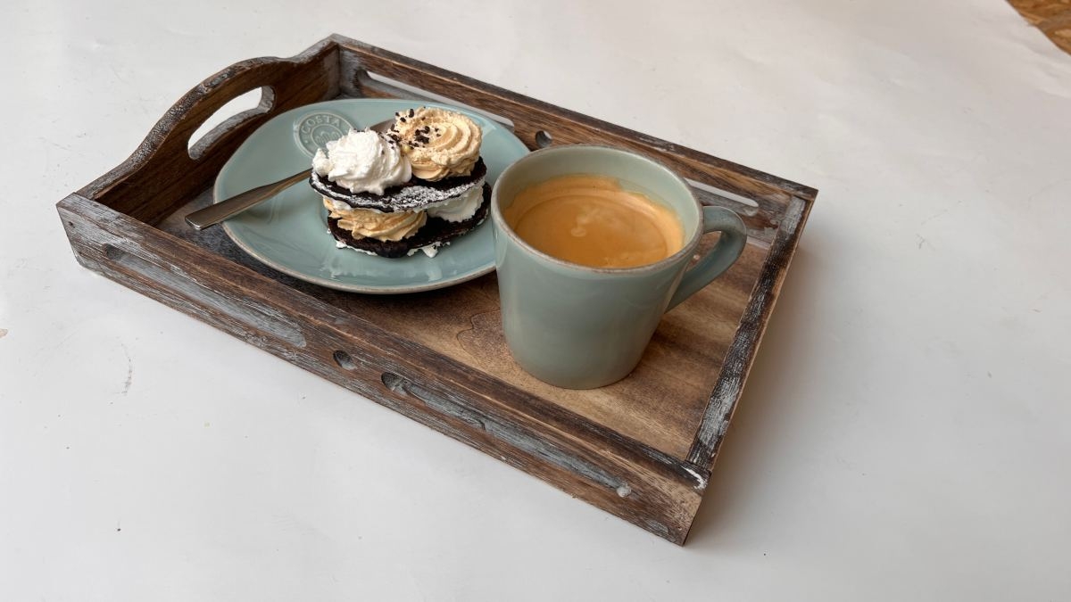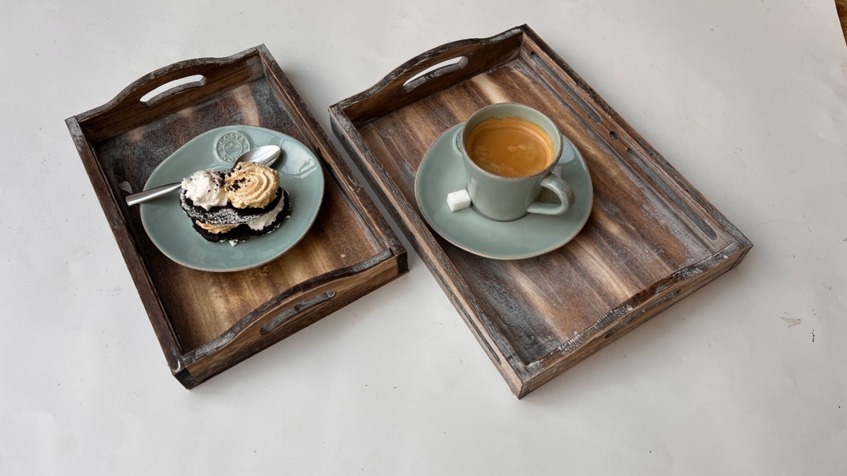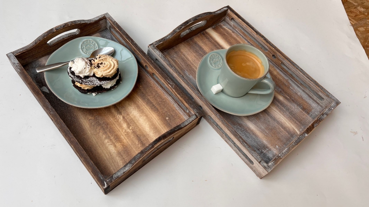 Drevený podnos obdĺžnikový môže slúžiť aj ako štýlová dekorácia. Menšia tácka je vložená v priestore veľkého.