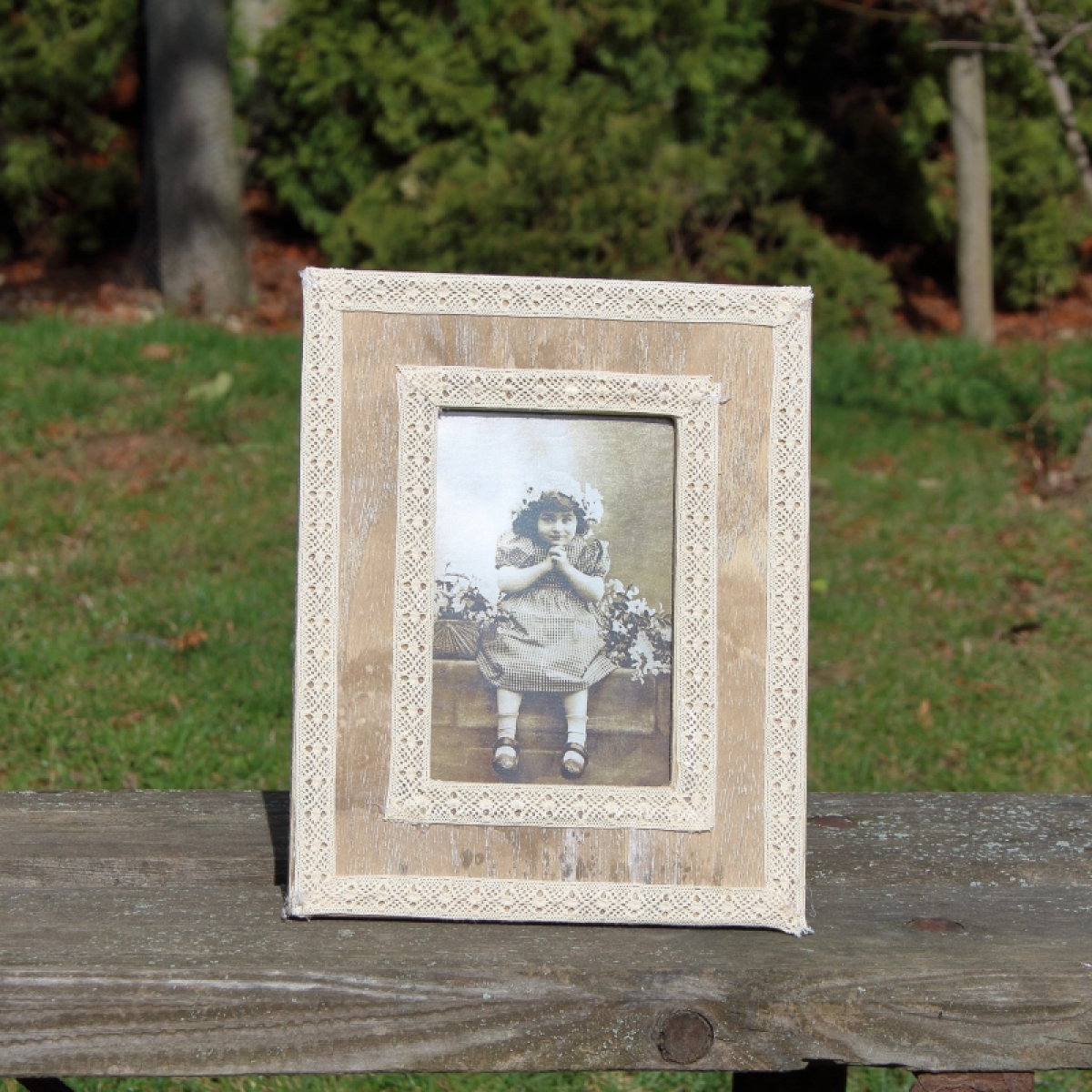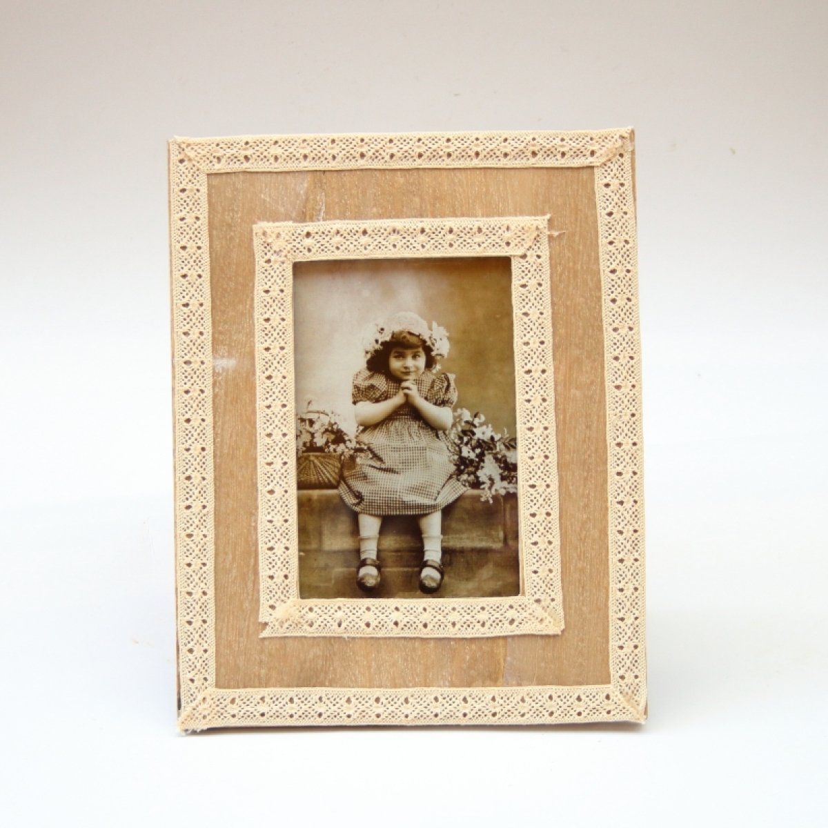 Drevený rámik je navyše doplnený krásnou jemnou čipkou.