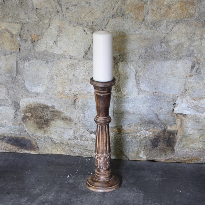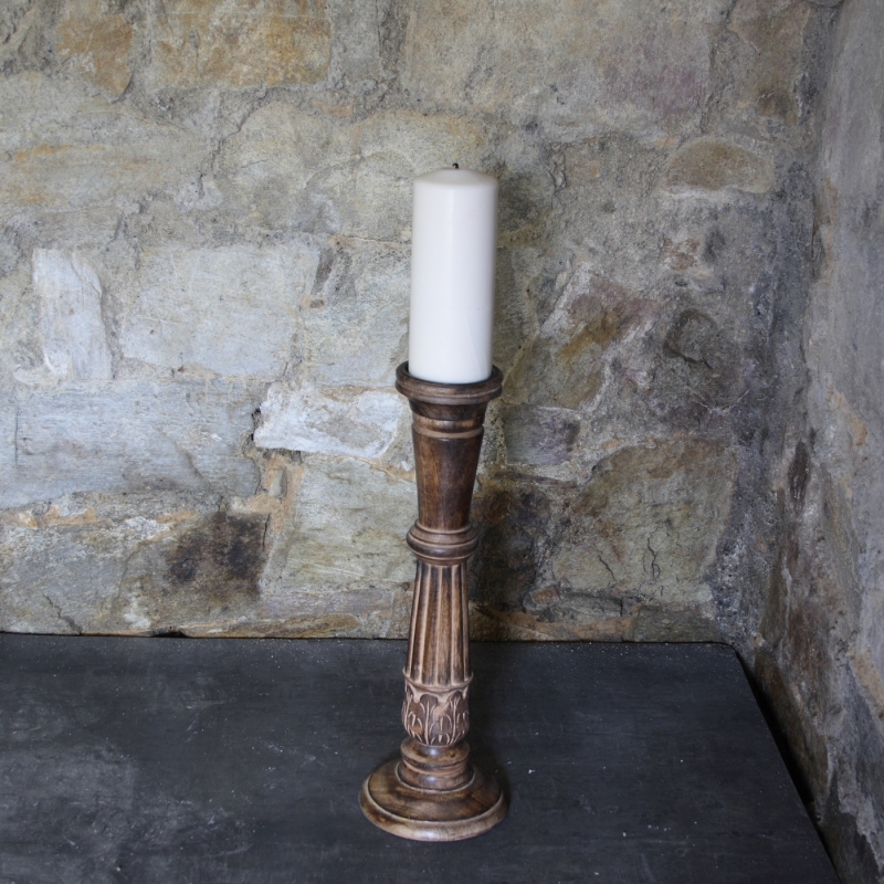 Svietnik z masívneho dreva je neprehliadnuteľný aj pre svoju výšku. Na stole či komode bude žiariť.