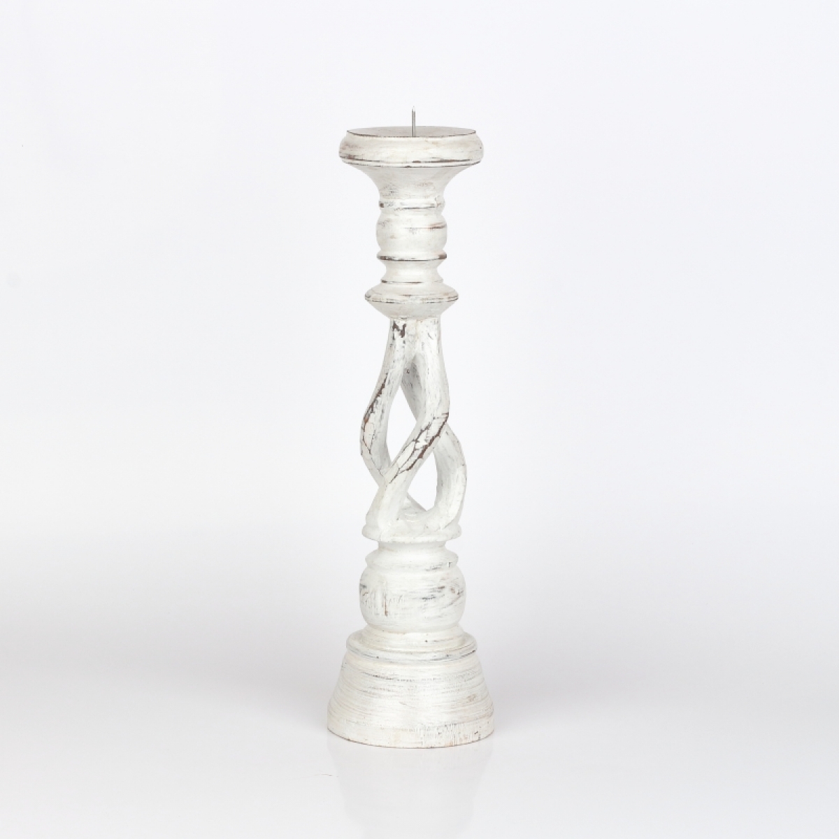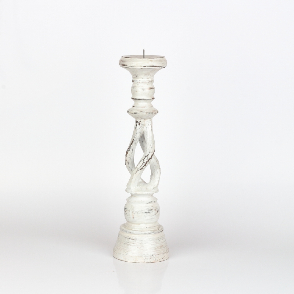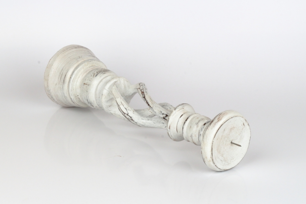 Drevený svietnik biely s patinou 35cm má krásne vyrezávané tvary a patina a olúpaný vzhľad mu dodáva nádych starých časov.