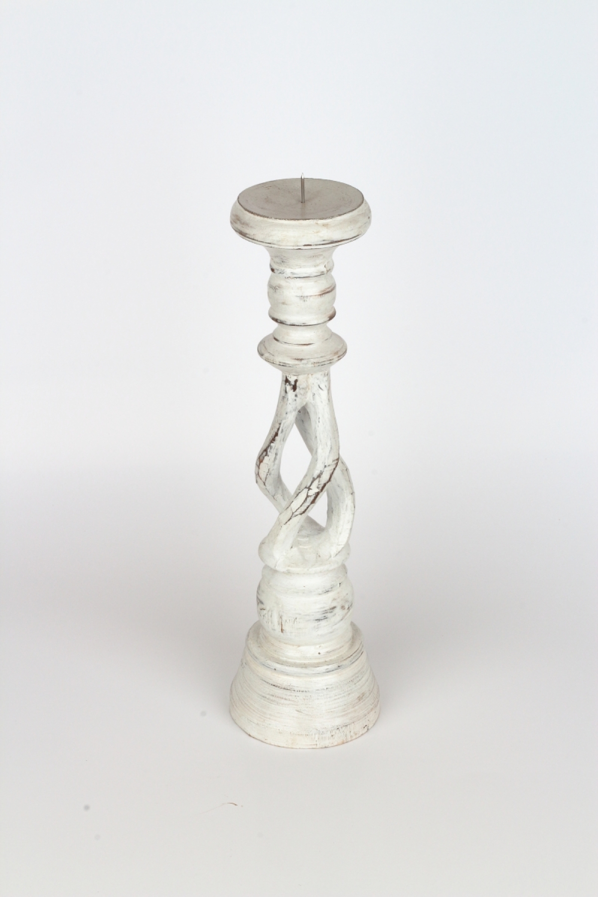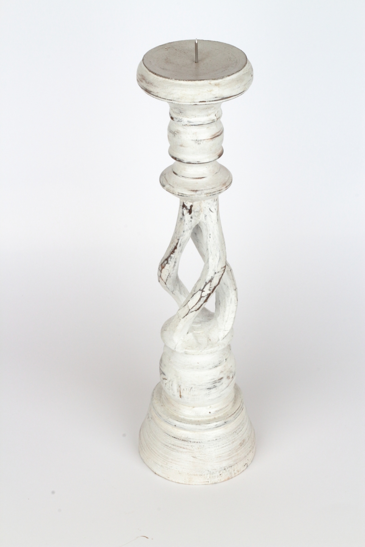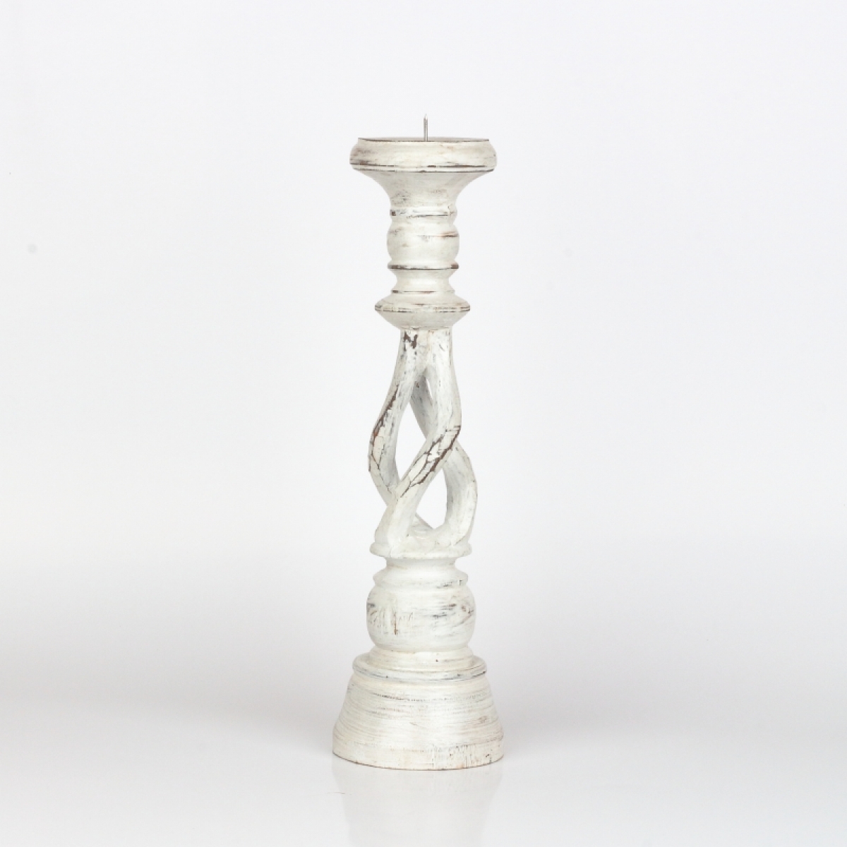 Drevený svietnik biely s patinou 35cm má krásne vyrezávané tvary a patina a olúpaný vzhľad mu dodáva nádych starých časov.