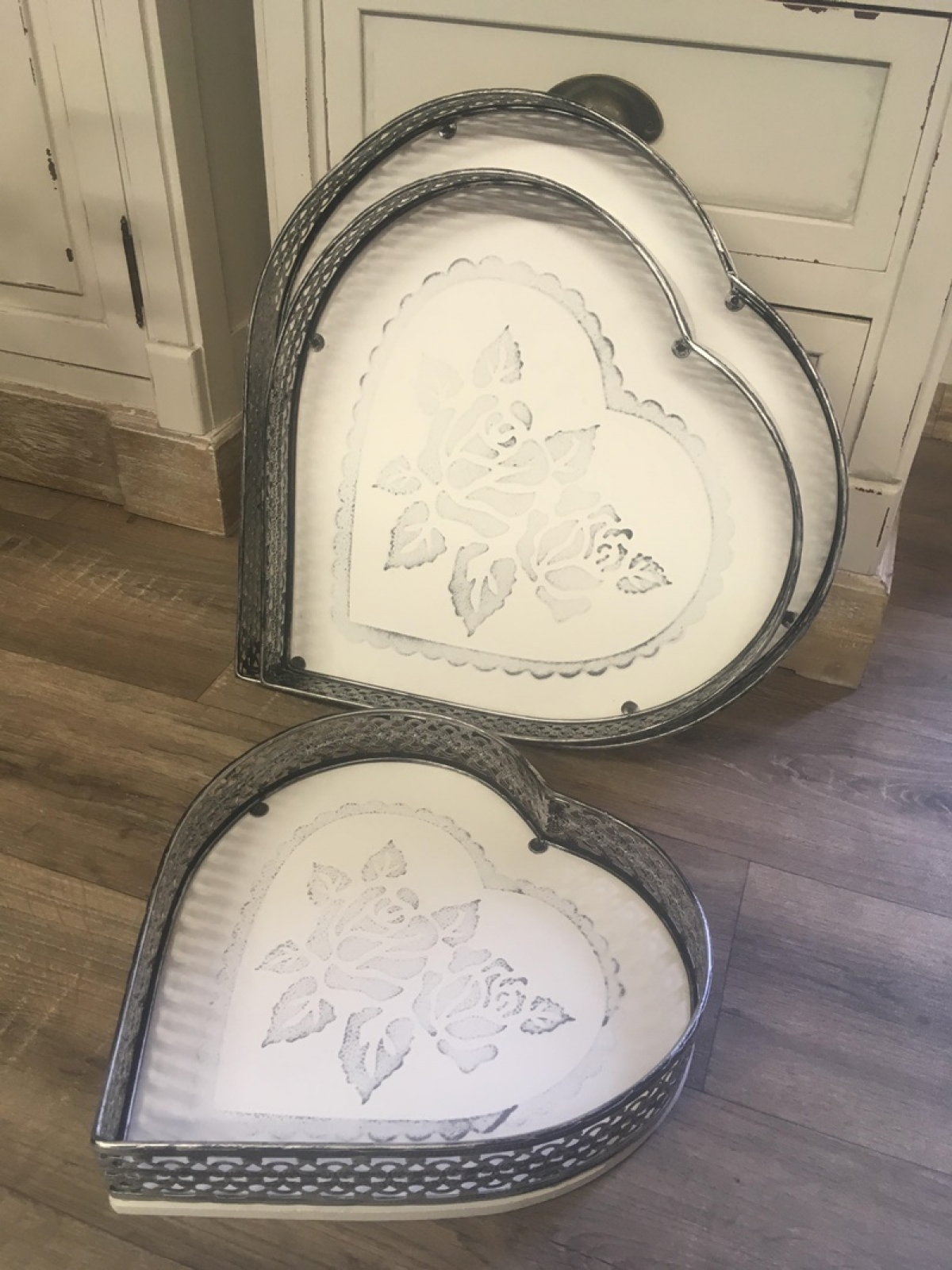 Tácka má drevené dno v bielej patine a kovové zdobené okraje.