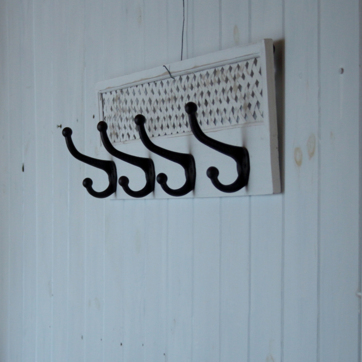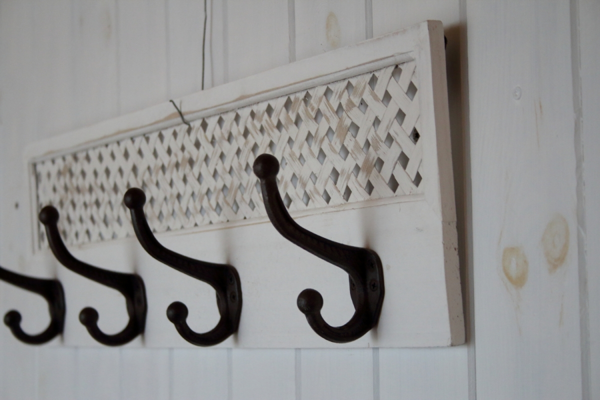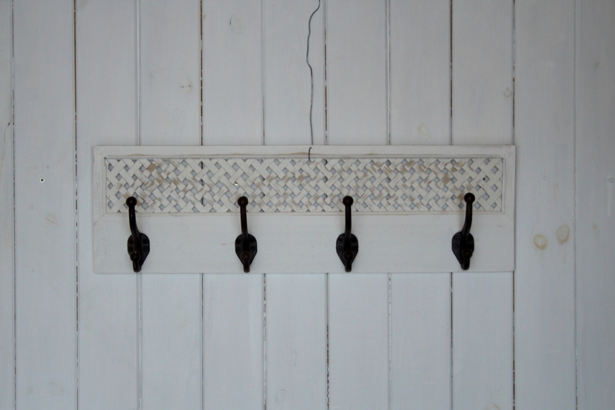 Stylový dřevěný věšák se čtyřmi kovovýmu háčky. Nepatrné poškození vyobrazeno na fotografiích č. 6. a 7.