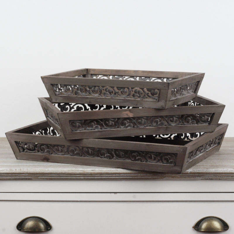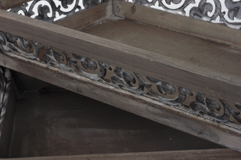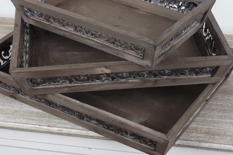 Drevený vintage podnos (set 3ks) s ozdobnými kovovými ornamentmi na stranách a jemnou patinou.