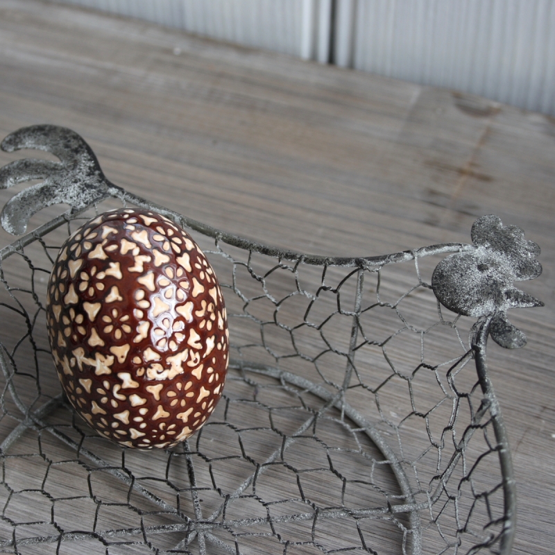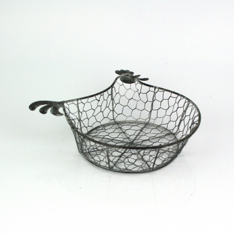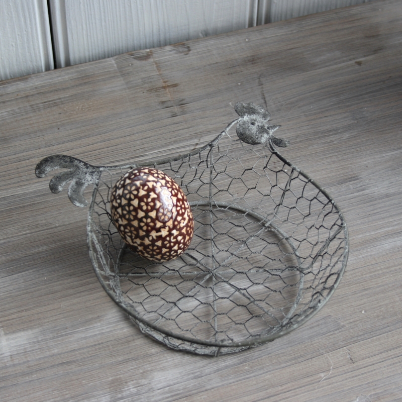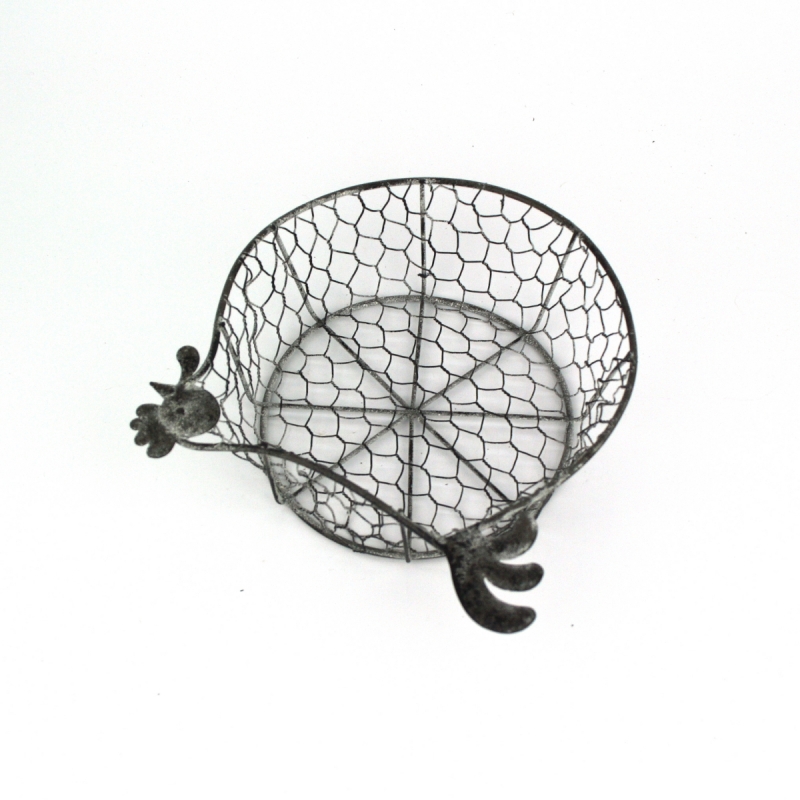 Drôtený guľatý košík je upravený do tvaru sliepočky. Materiál s jemnou patinou dodáva košíka ošumelá vzhľad, ktorý rozhodne nie je na škodu.