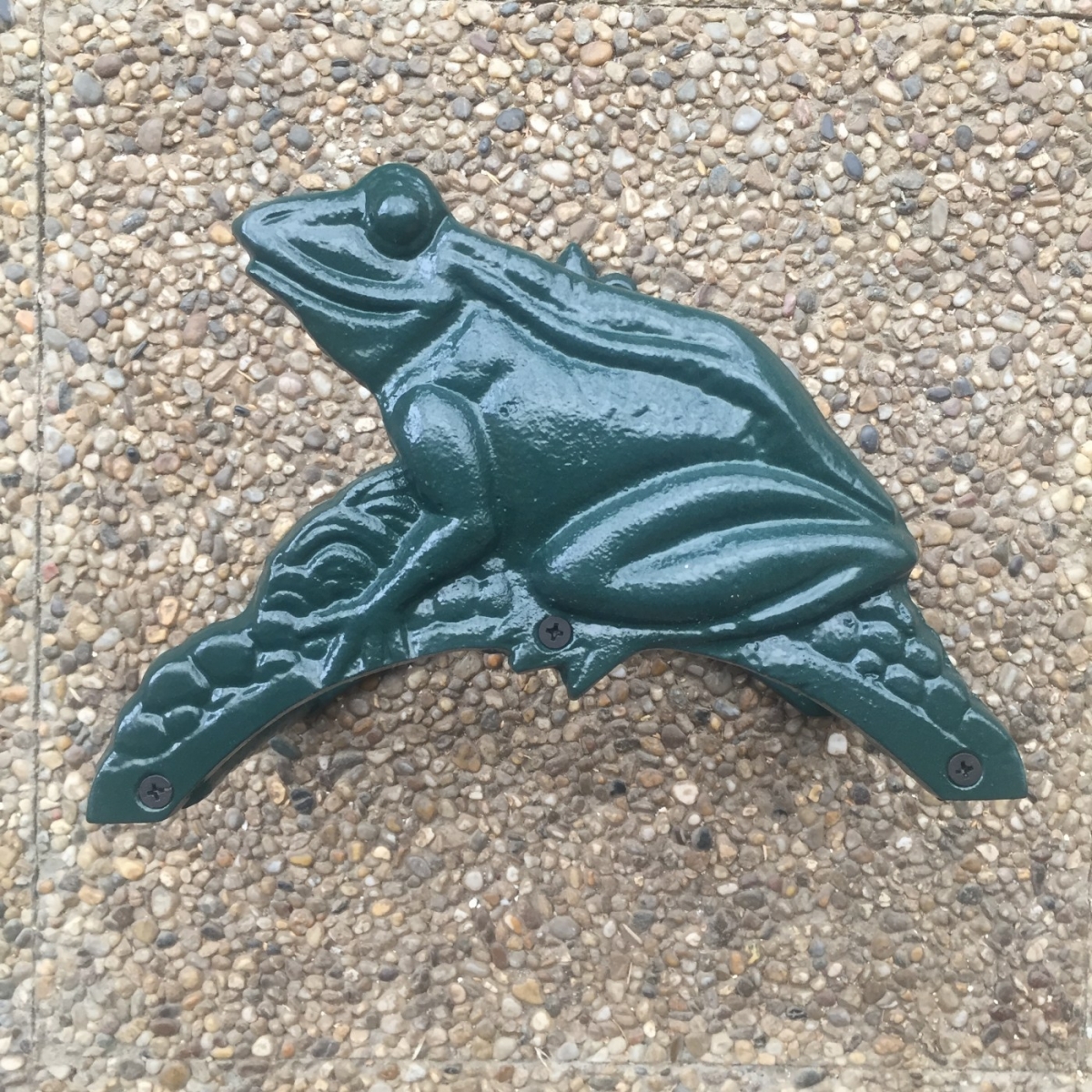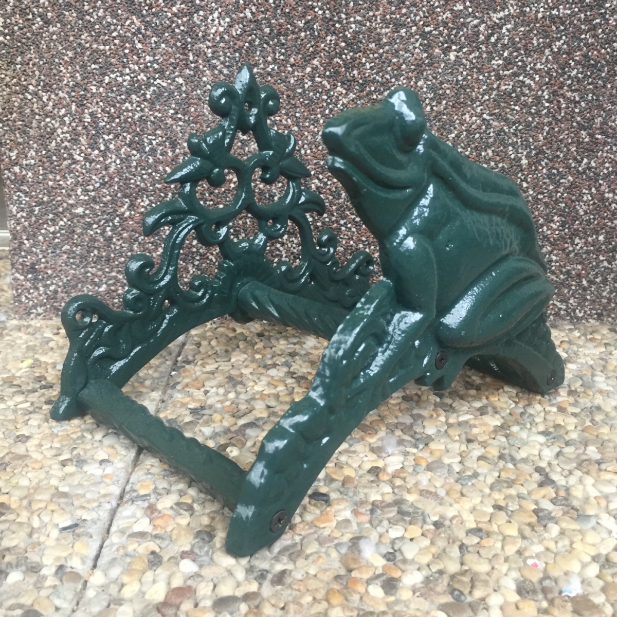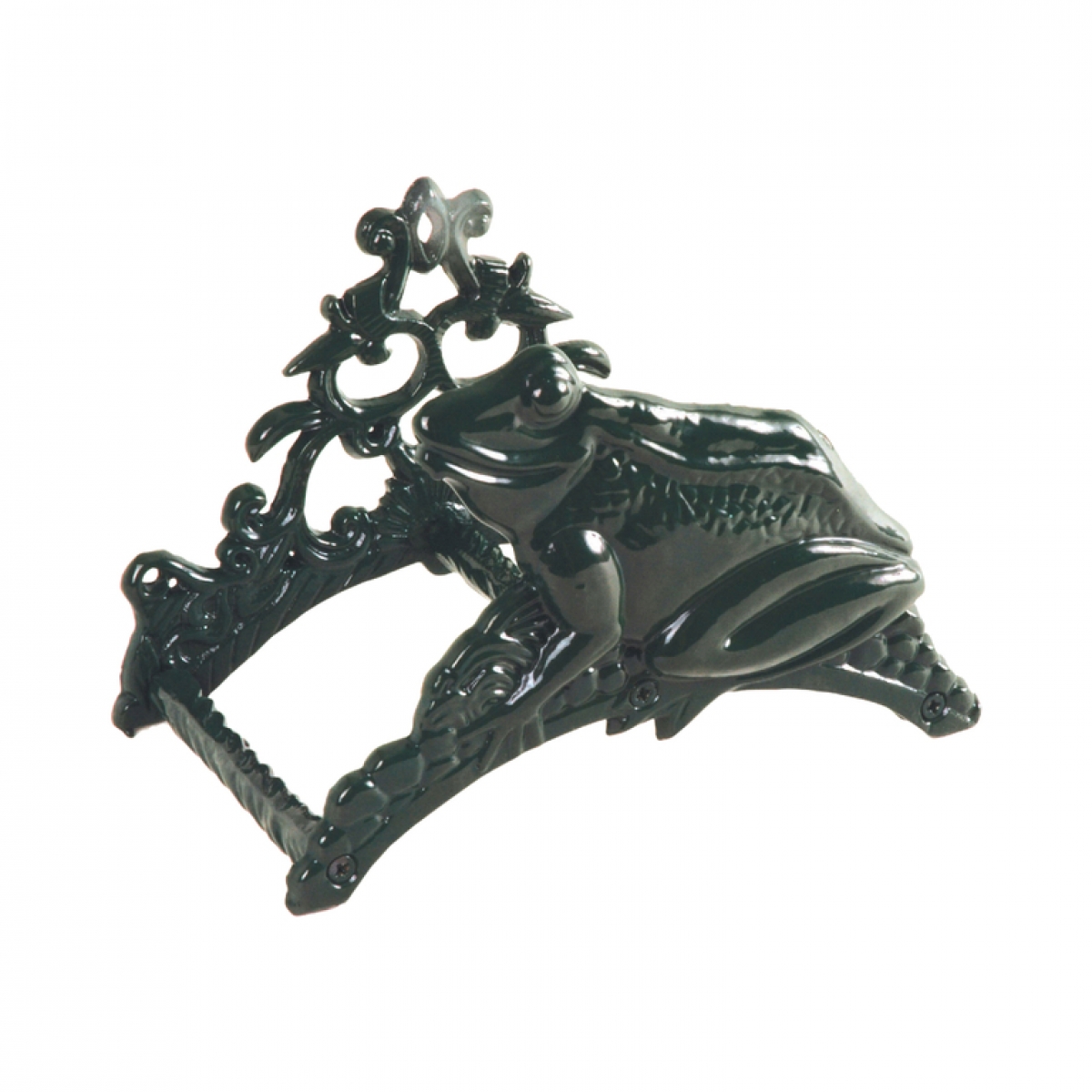 Držiak na hadicu na stenu s dekoráciou sediaci žaby v tmavo zelenom prevedení.