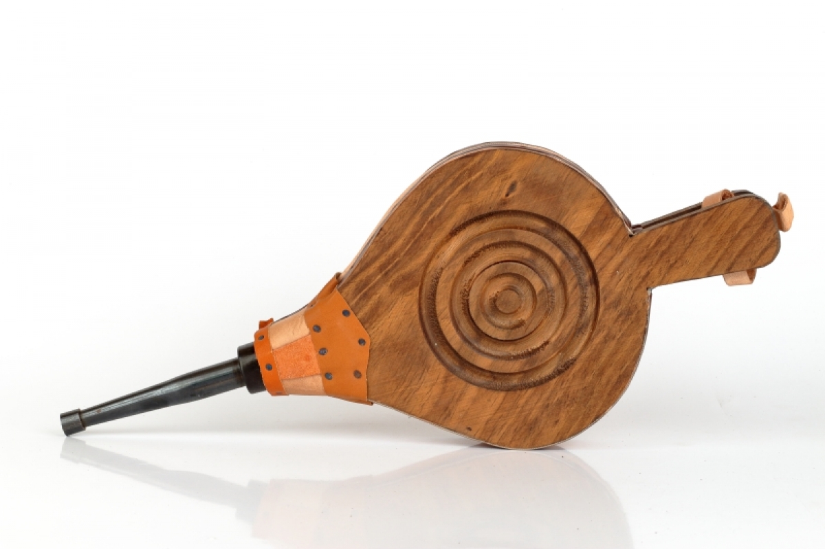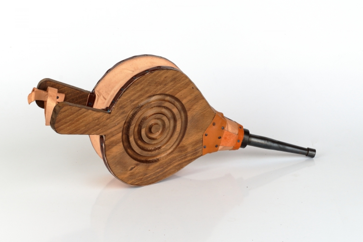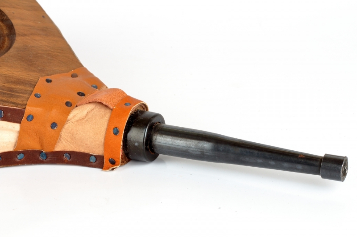 Funkčná krbovej dúchadlo je vyrobené z dreva, zdobené vypaľovaním, cvočky a doplnky z pravej kože.