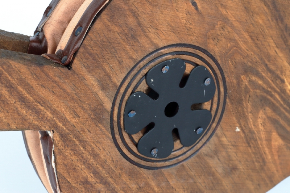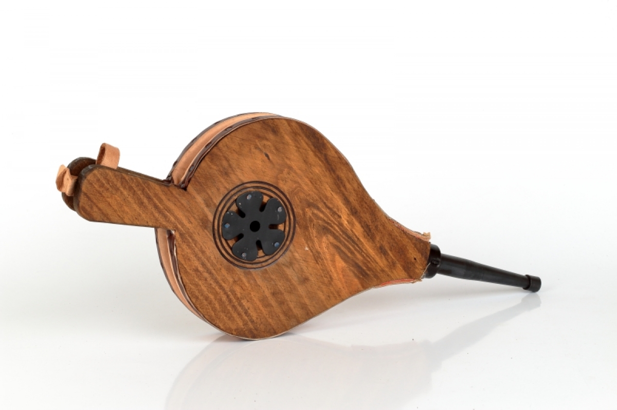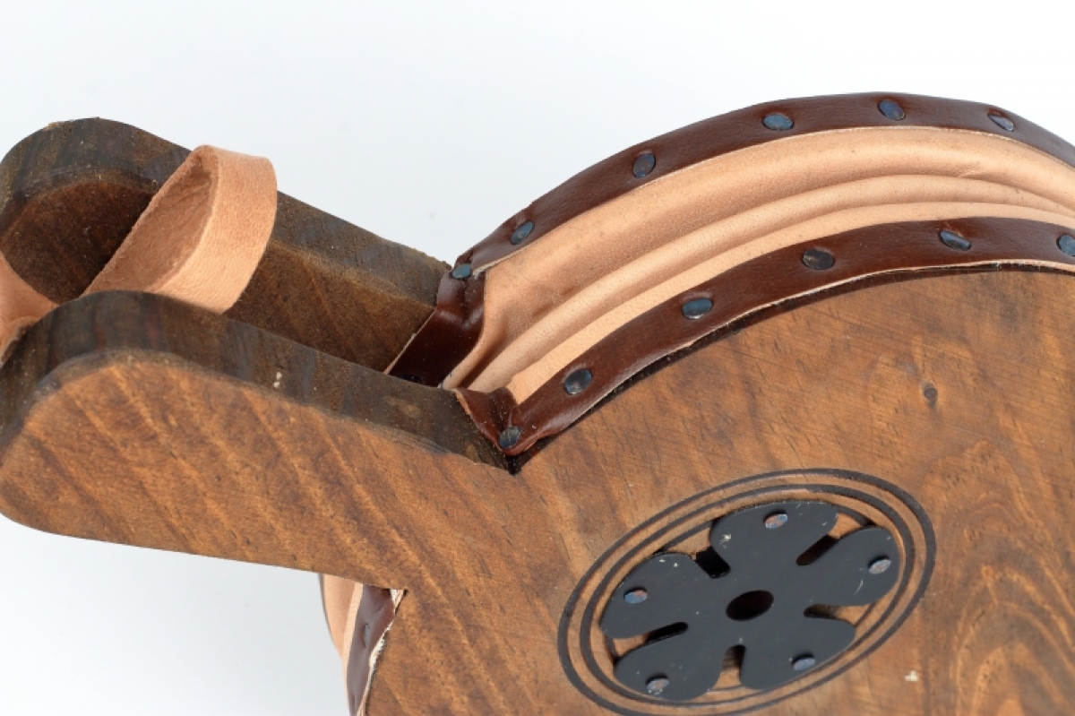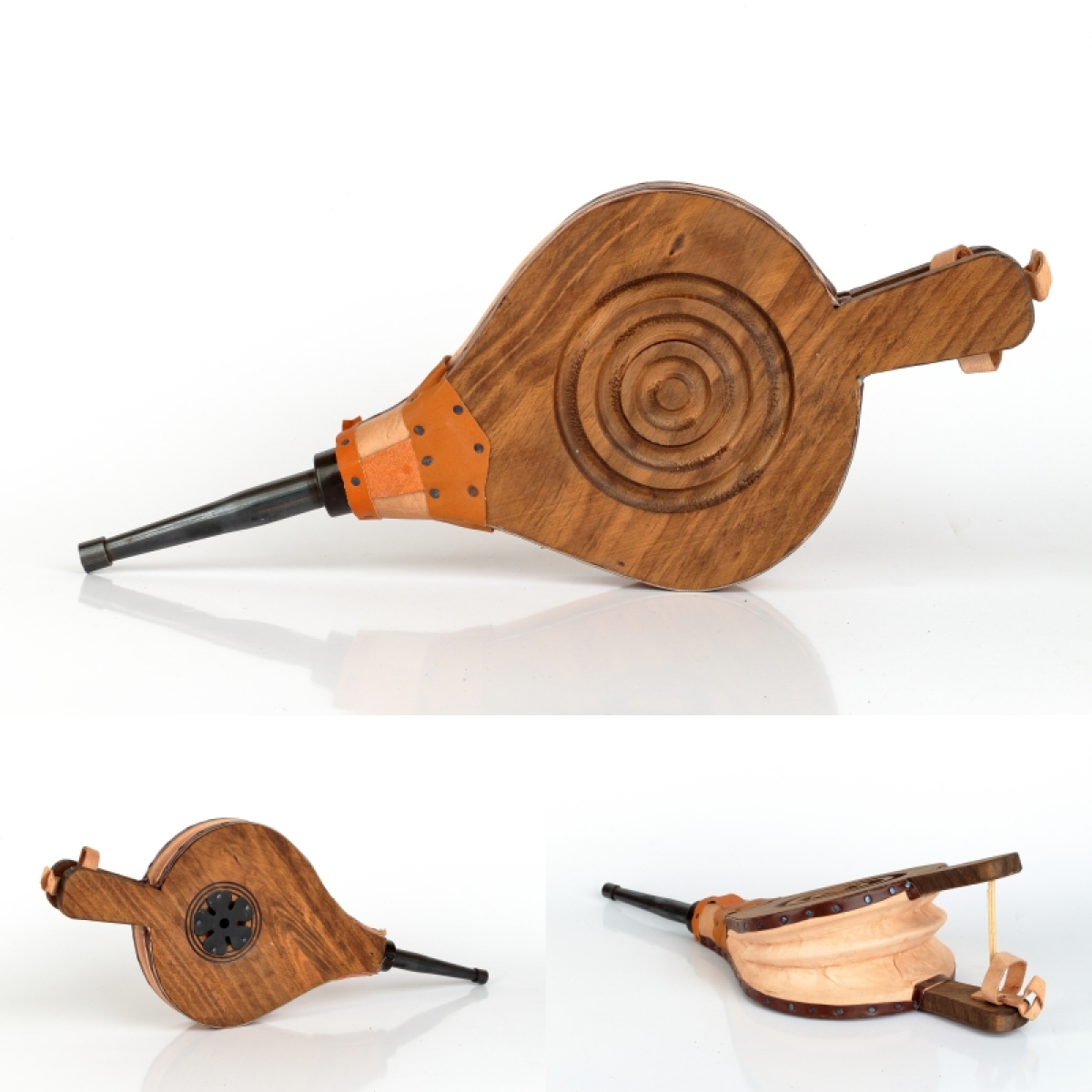 Funkčná krbovej dúchadlo je vyrobené z dreva, zdobené vypaľovaním, cvočky a doplnky z pravej kože.