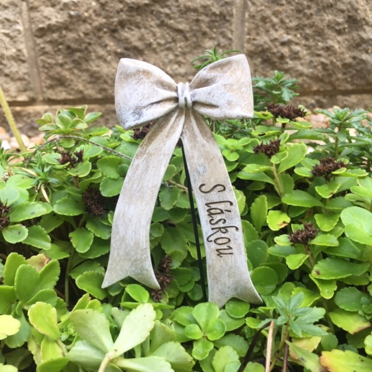 Dušičková dekorácia na hrob v tvare mašle s nápisom „S láskou“ bude krásnym doplnkom pre dušičkový aranžmán. Smútočná mašľa môže zdobiť dušičkový veniec alebo vysadenú misku. Vďaka kovovej tyčinke ju môžete zapichnúť kamkoľvek.