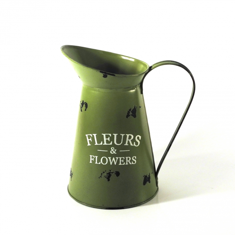 Džbán s průměrem 14 cm má výšku 23 cm. Jeho šířka i s uchem je 20,5 cm. Pro tento džbán najdete mnohostranné využití. Je plechový a má přírodní zelenou barvu. Hodit se vám bude jak doma, tak venku. Můžete do něj nalévat nápoje nebo aranžovat luční květiny. Nebo jím potěšíte někoho blízkého? To už záleží na vás. Na jeho přední části najdete bílý nápis FLOWERS. Z toho se dá usoudit, že džbán si o společnost květin přímo říká.