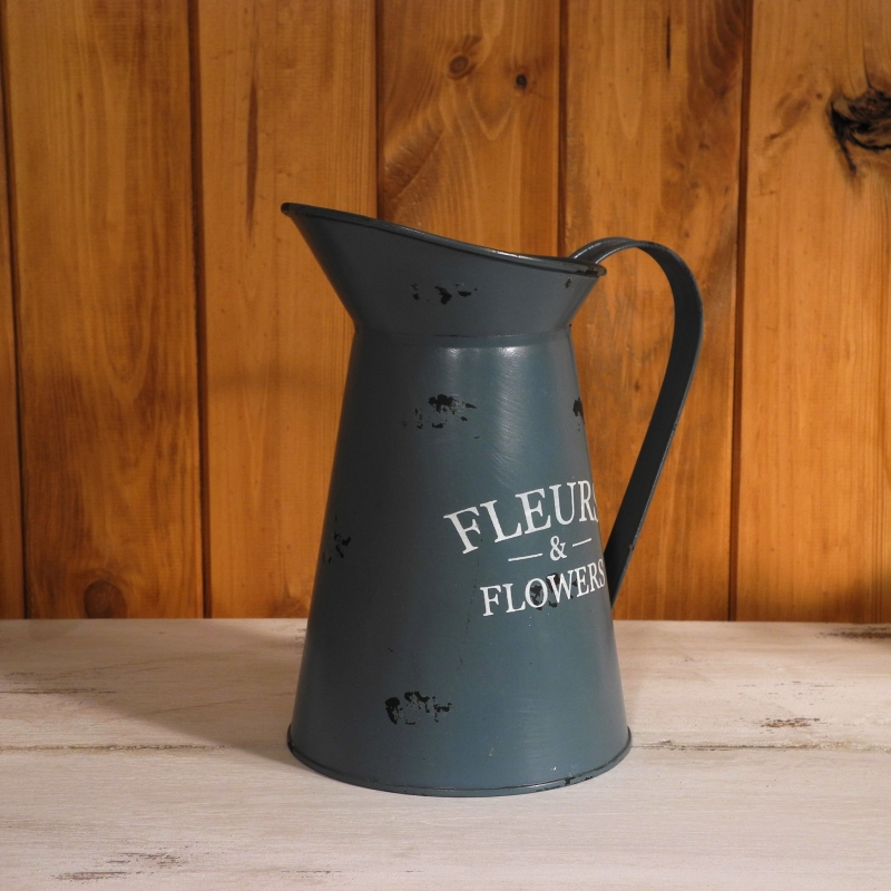 Džbán s priemerom 14 cm má výšku 23 cm. Jeho šírka aj s uchom je 20,5 cm. Tento džbán si u vás doma nájde určite všestranné využitie. Je vyrobený z plechu, preto sa nemusíte báť používať ho vonku. Rovnako tak sa bude vynímať aj doma. Džbán môže použiť na nápoje, ale aj ako vázu na kvety .... obzvlášť tie letné a obyčajné, ako sú margaréty, nevädze, alebo vlčie maky v ňom budú vyzerať priamo báječne. Ostatne to, že do džbánu môžete aranžovať kvetiny, hovorí aj biely nápis, ktorý ho zdobí. Džbán má neutrálnu šedú farbu.
