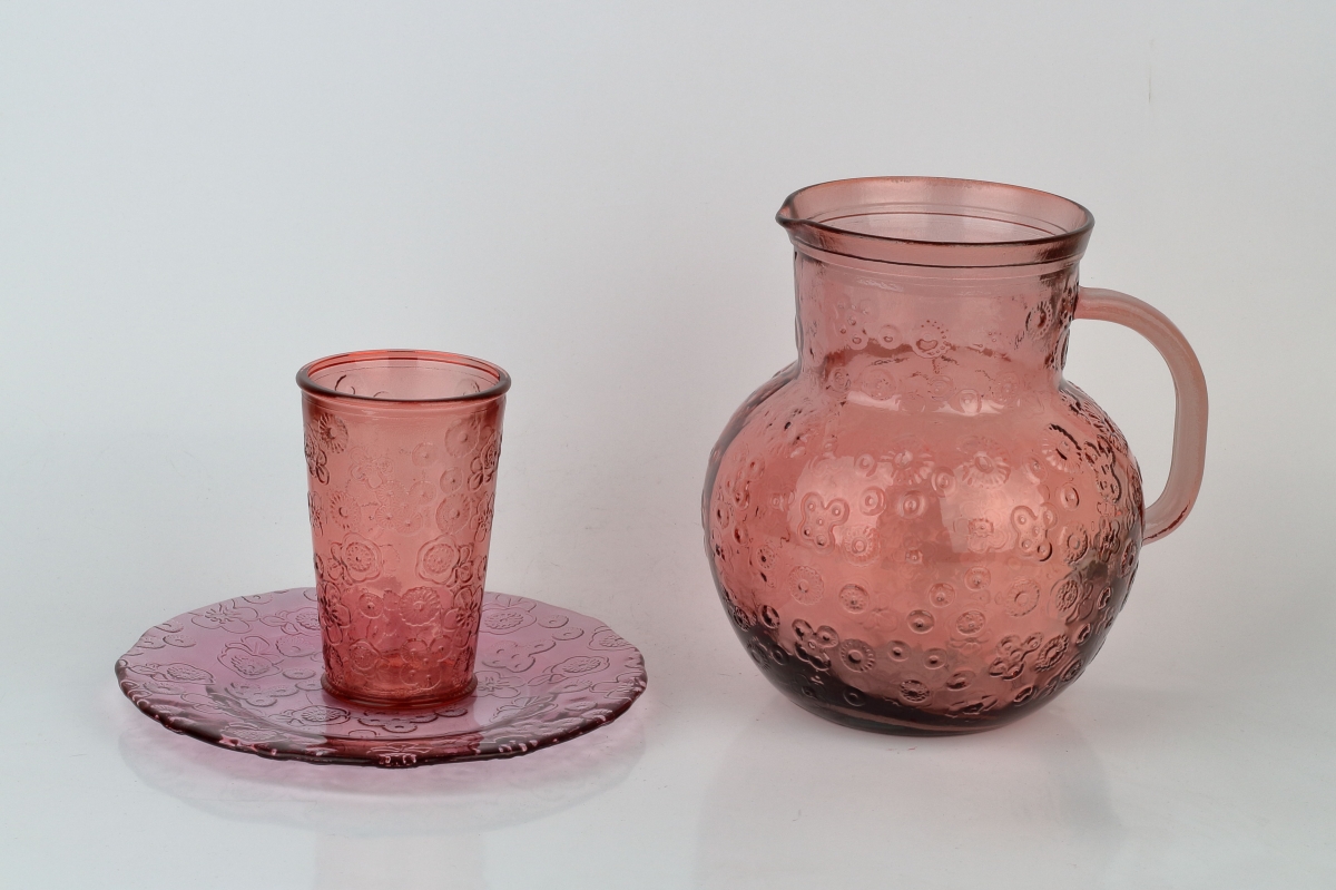 Do ružova zafarbené sklo spoločne s motívom drobných kvietkov perfektne vynikne na prestretom stole a dodá jedálni i kuchyni svieži nádych. < br />