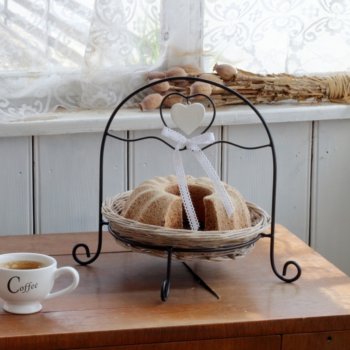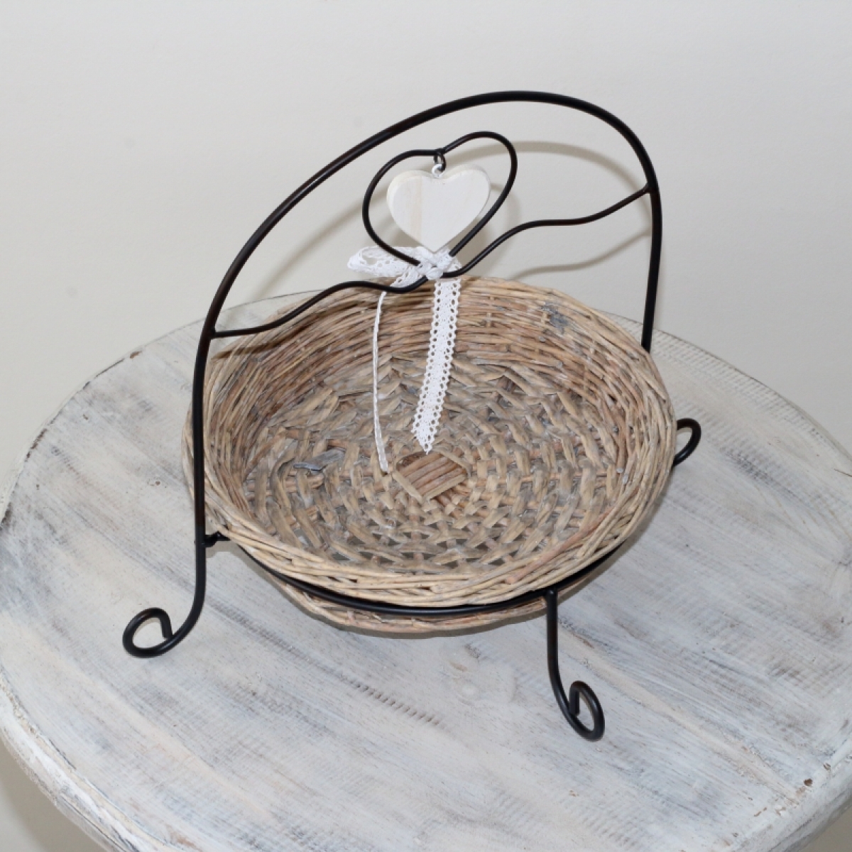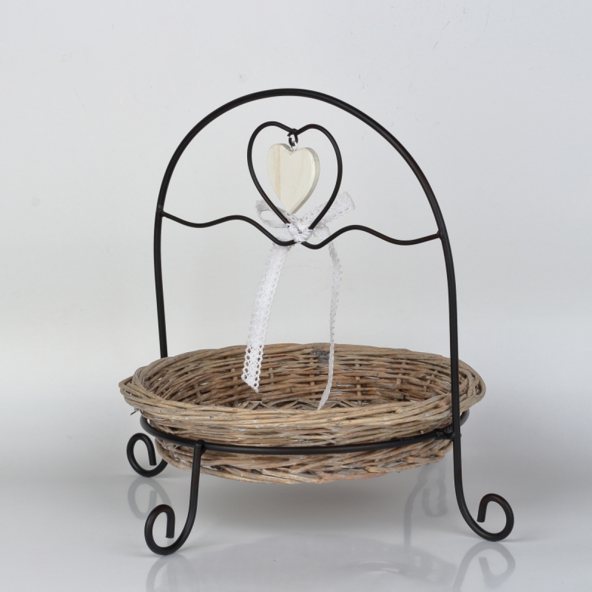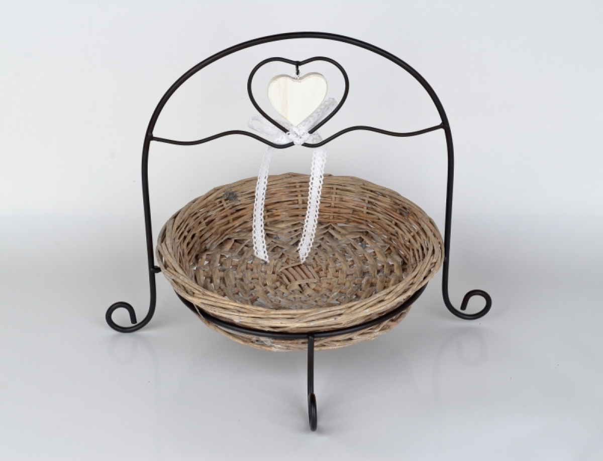 Kovová konštrukcia s vyberateľným prúteným podnosom.