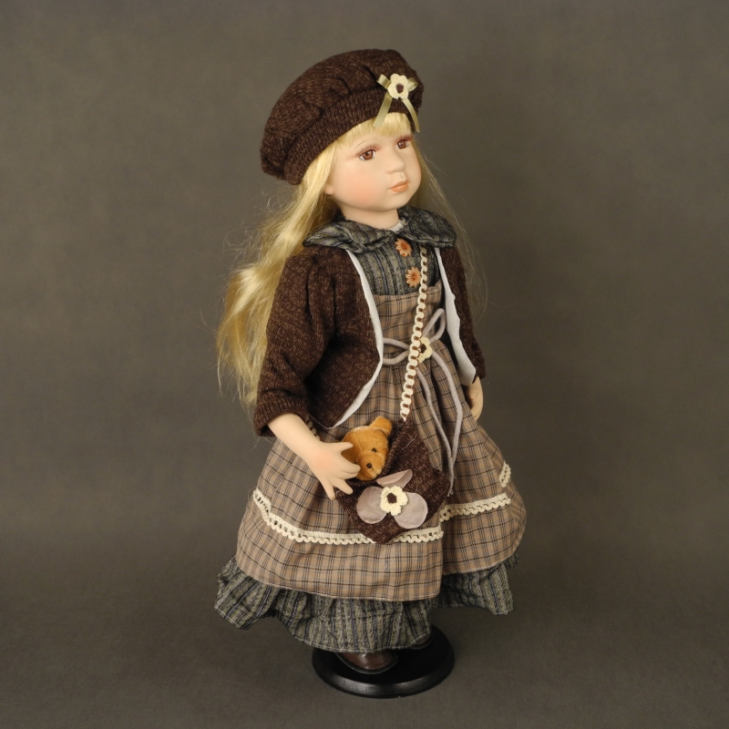 Exkluzivní sběratelská panenka Gabriela 60cm, má oblečený pletený hnědý svetřík s bílou podšívkou, dlouhé hnědé šaty, přes rameno pletenou kabelku s medvídkem a na její blonďaté vlásky pokrývá pletená čepice zdobená pletenou kytičkou s mašlí ze stuhy.