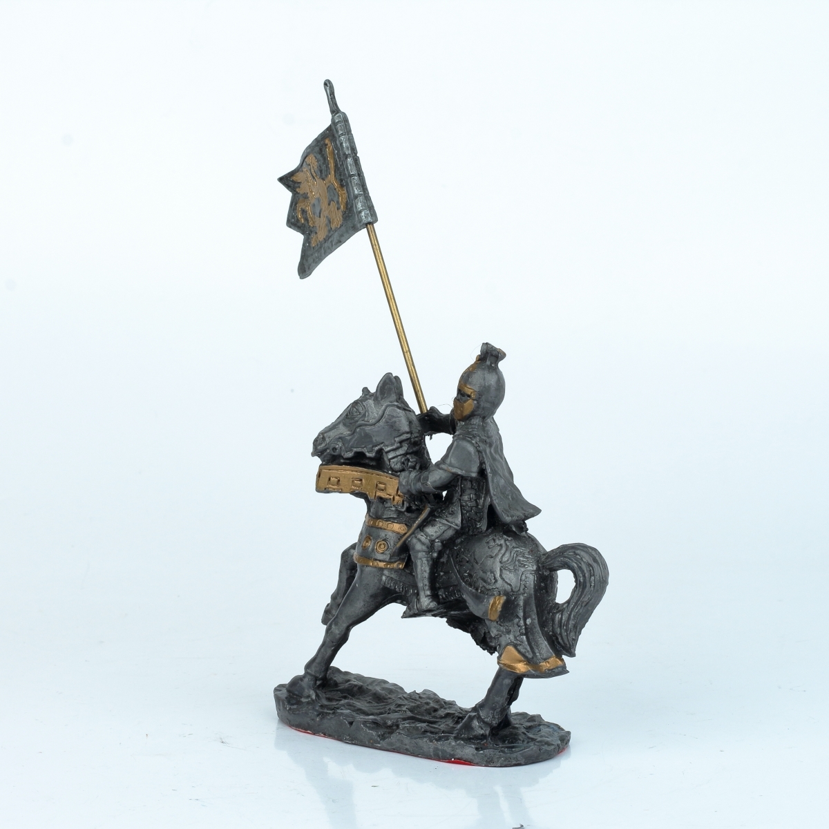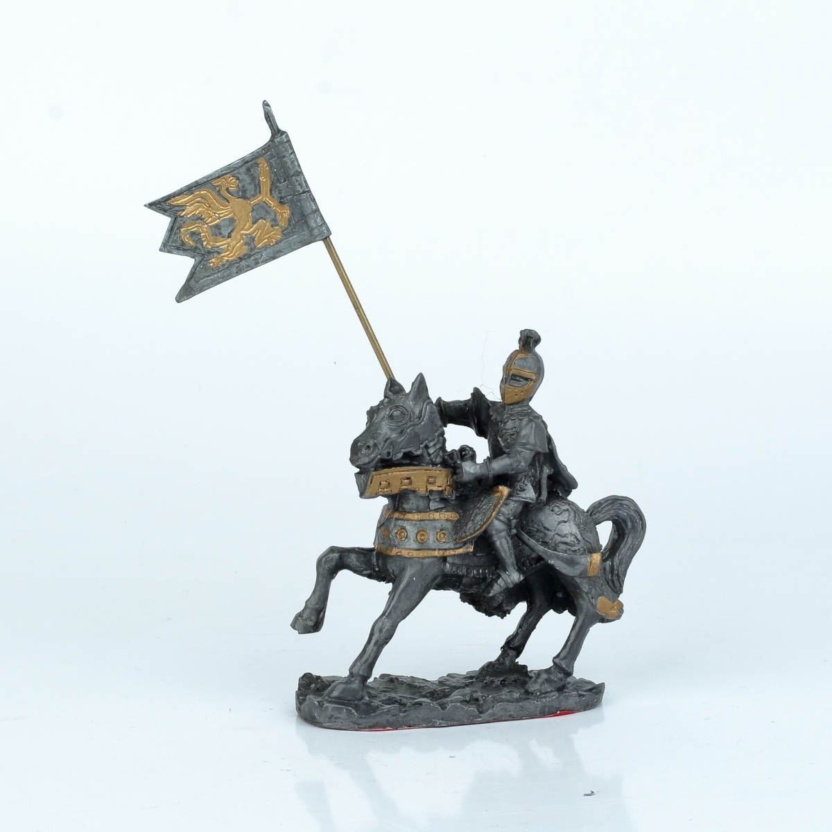 Tým, ktorí sa radi ponárajú do histórie, a najmä obdivujú stredovekú kultúru, určite radosť urobí táto detailne prepracovaná figúrka rytiera na koni. Je zachytený v pohybe pri jazde. Kôň má niektoré detaily na postroji zdobené bronzom, ktorý nájdeme aj na zdobenie helmy rytiera, a tiež na vlajúcom prápore.