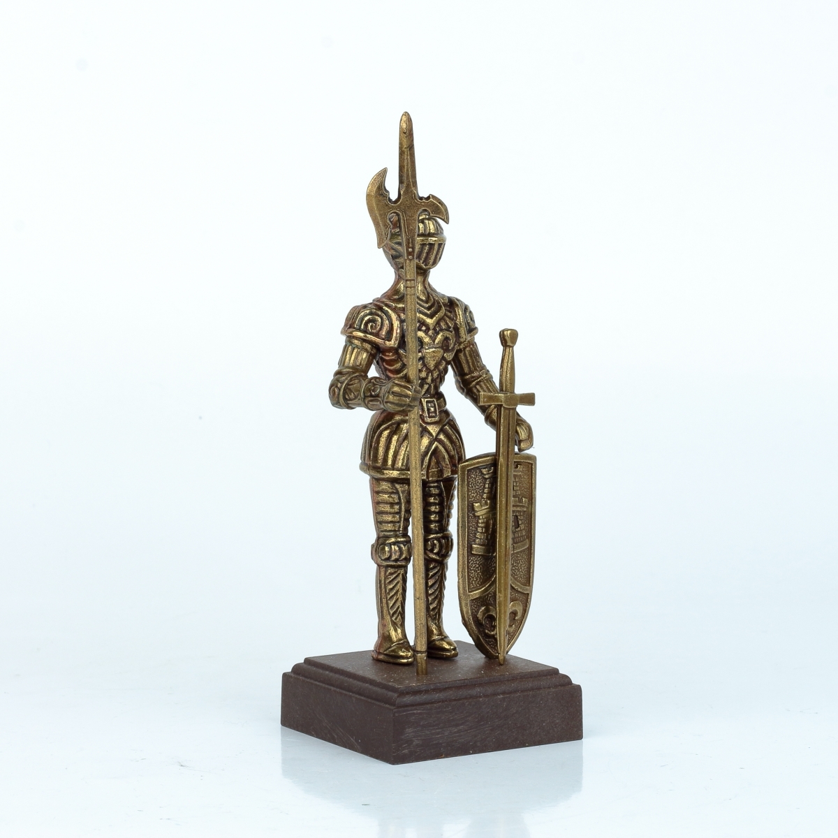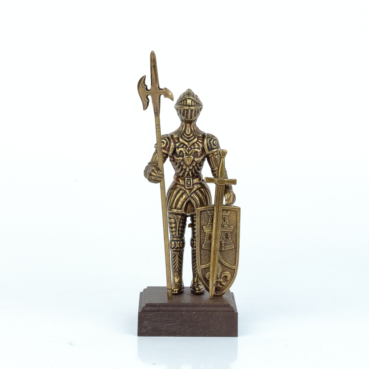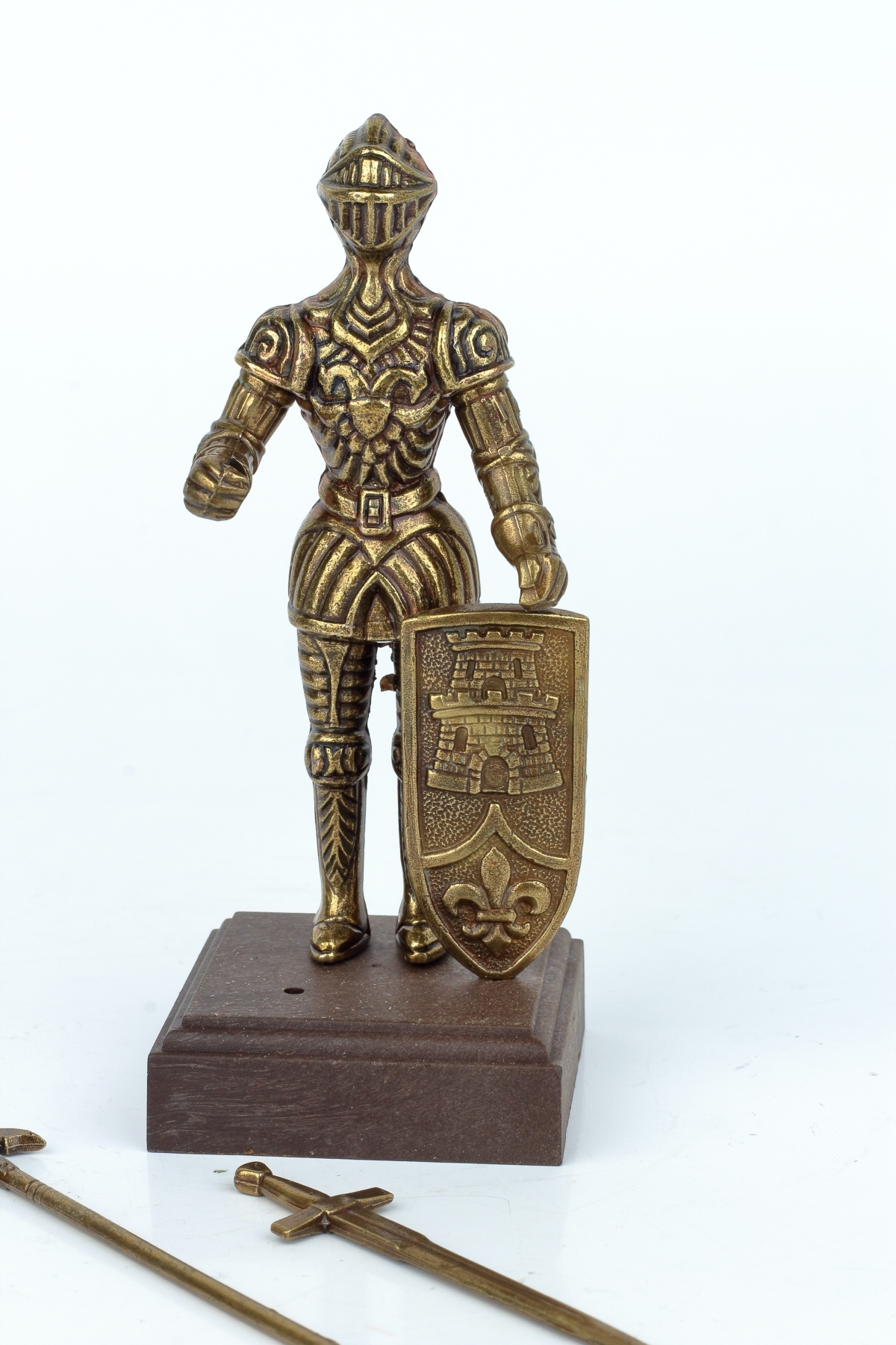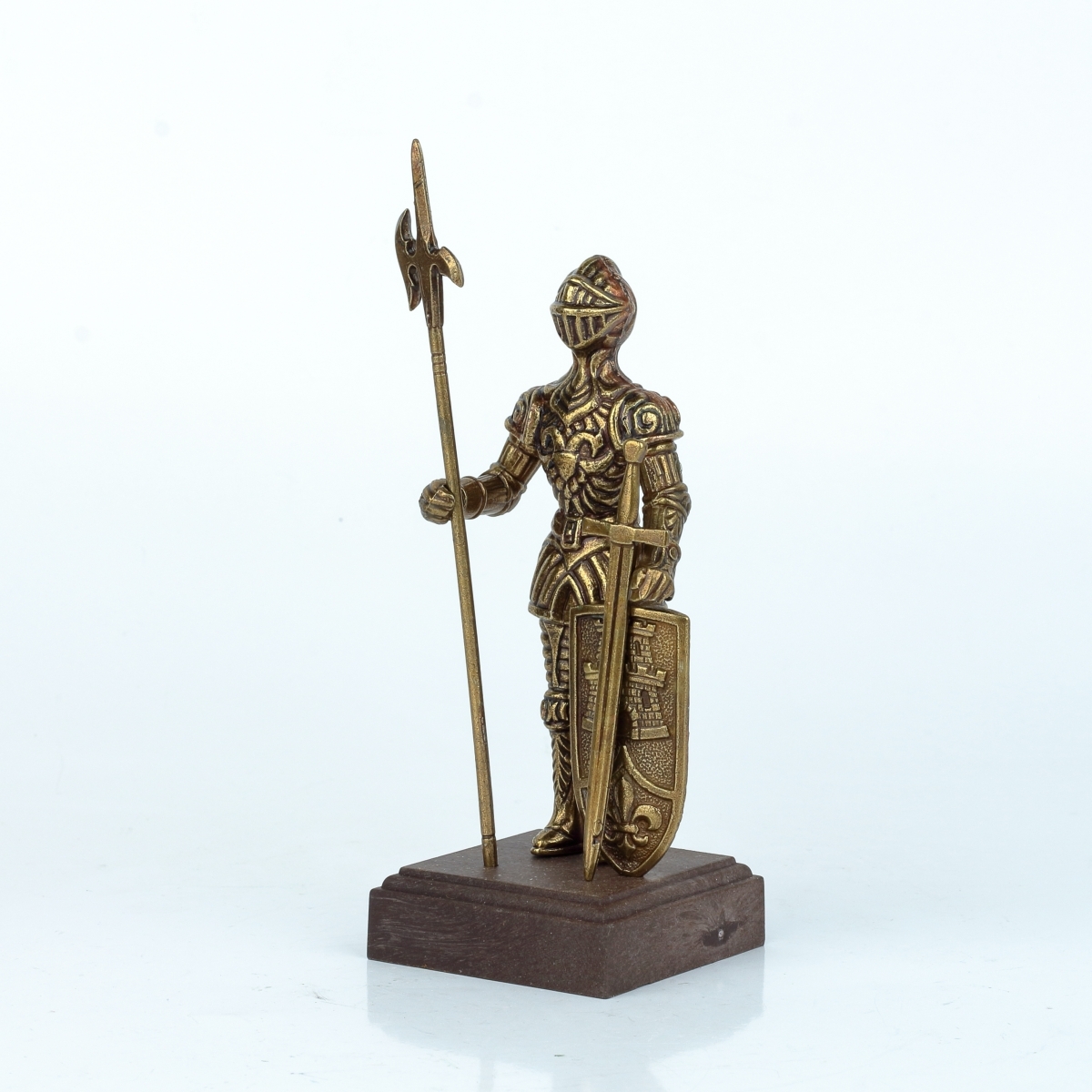 Táto figúrka rytiera v brnení je z kovu bronzovej farby a stojí na drevenom podstavci. Rytier má bohato zdobené brnenie a v rukách zviera halapartnu, alebo veľký meč, a štít s vyobrazením veže a symbolu ľalie.