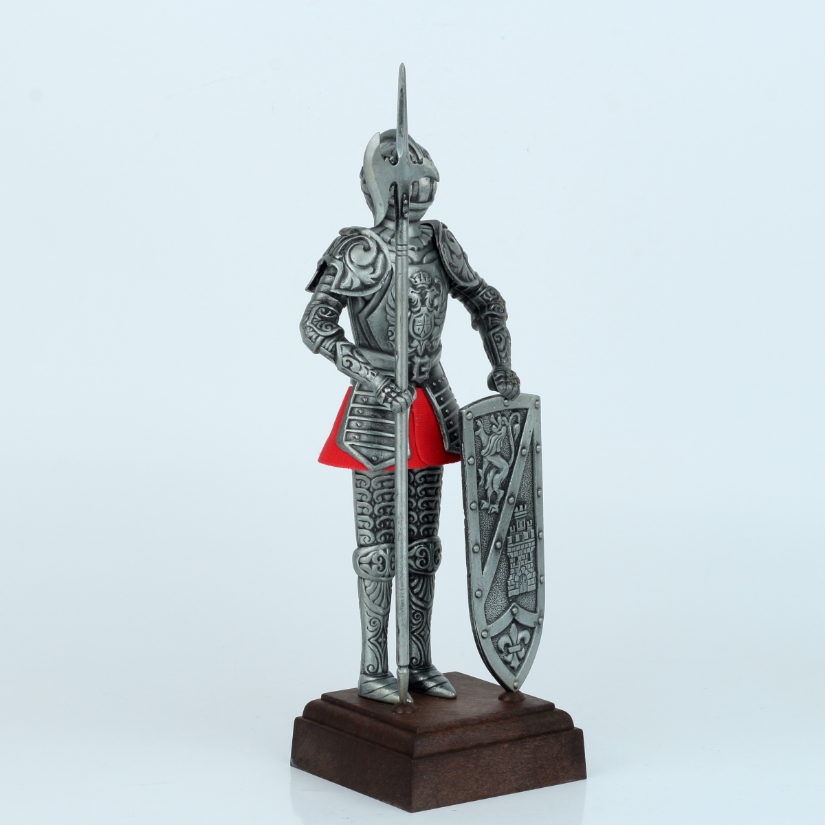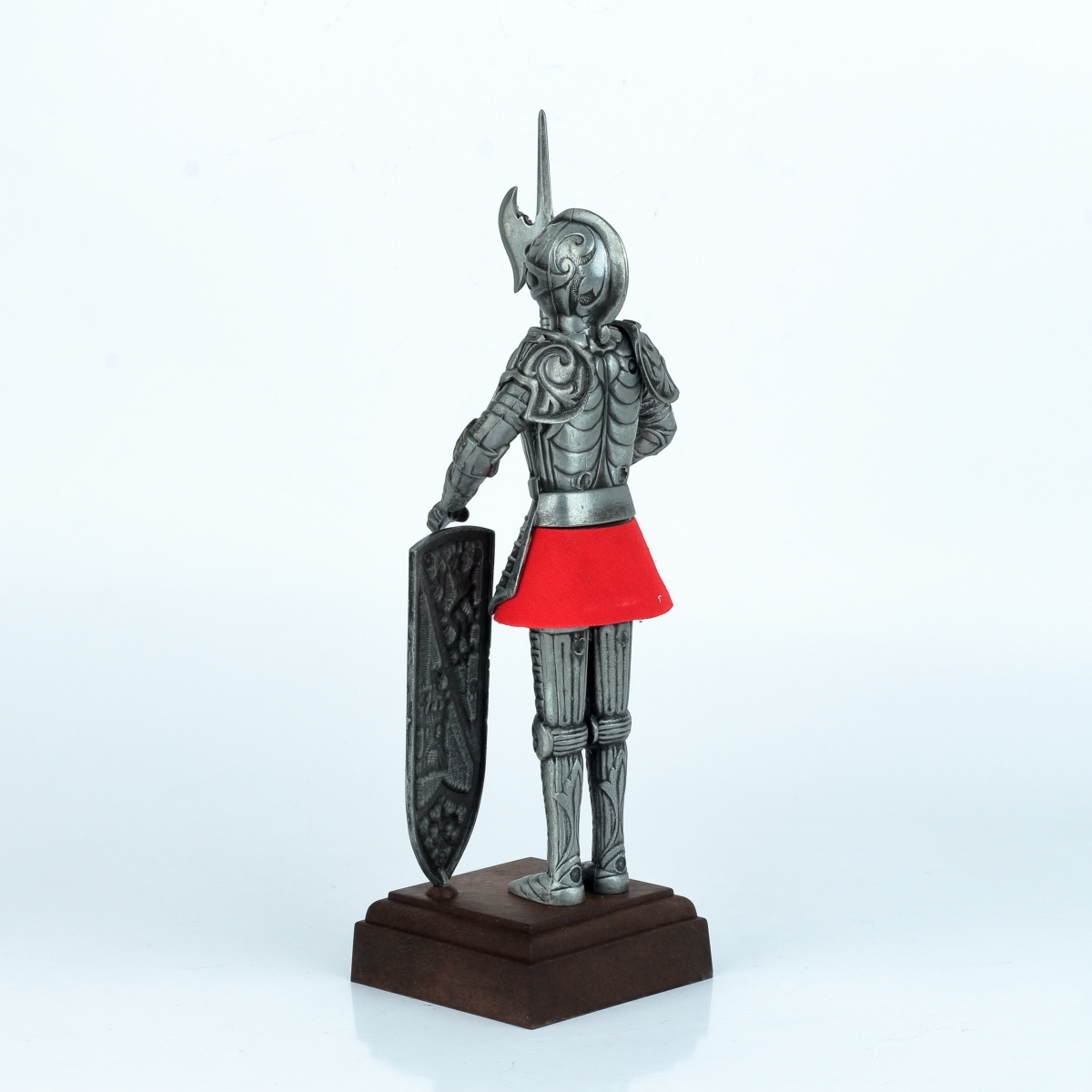 Figúrka rytiera je zo strieborného kovu s červenou suknicou vykukujúcou pod brnením. Rytier stojí pripevnený na tmavo hnedom podstavci, vyrobenom z dreva.
