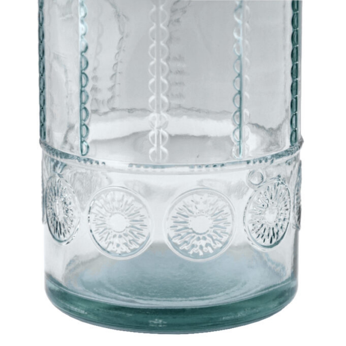 Fľaša na sirup s objemom 0,7 litra je vyrobená zo 100% recyklovaného zdobeného skla a opatrená korkovou zátkou.