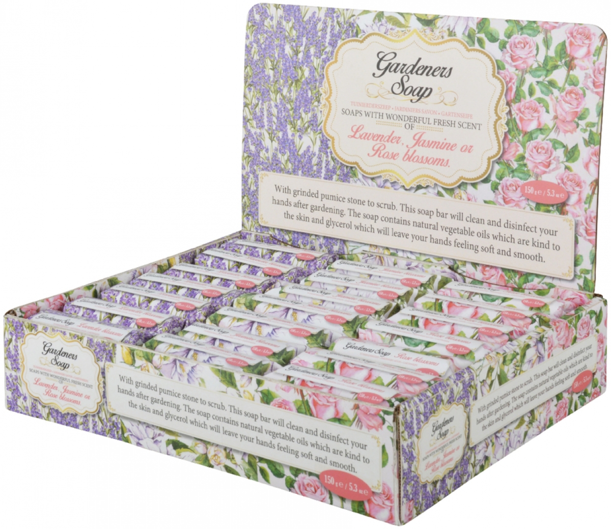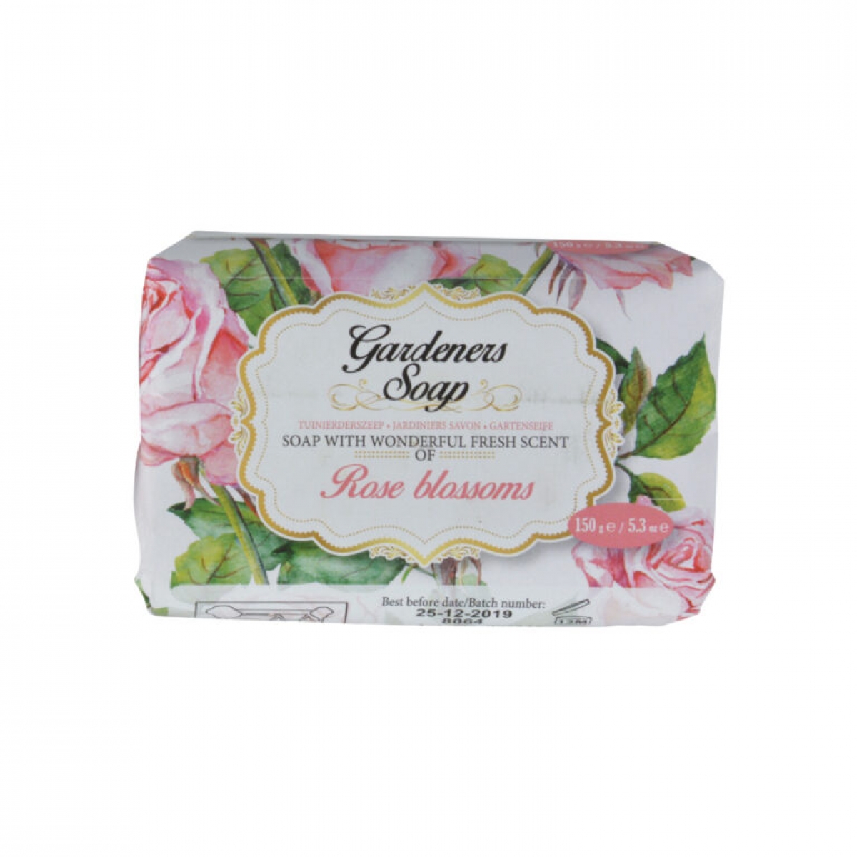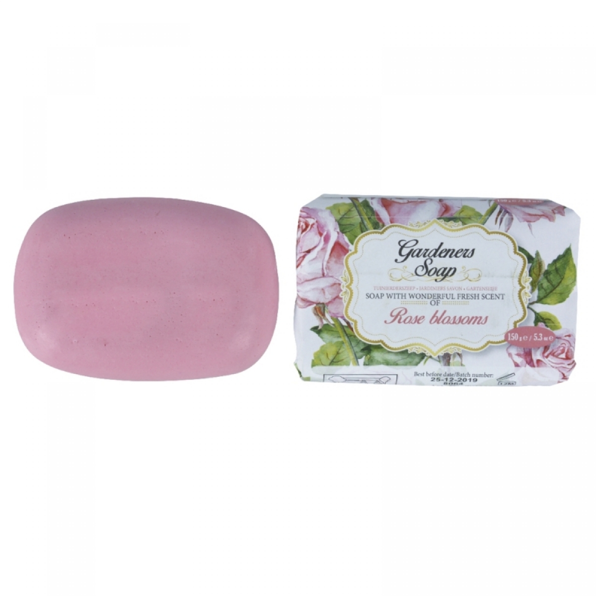 Glycerínové mydlo v sladkom ružovom odtieni je balené v papierovom obale s farebným kvetinovou potlačou.