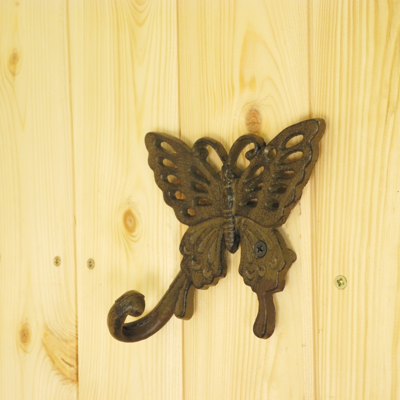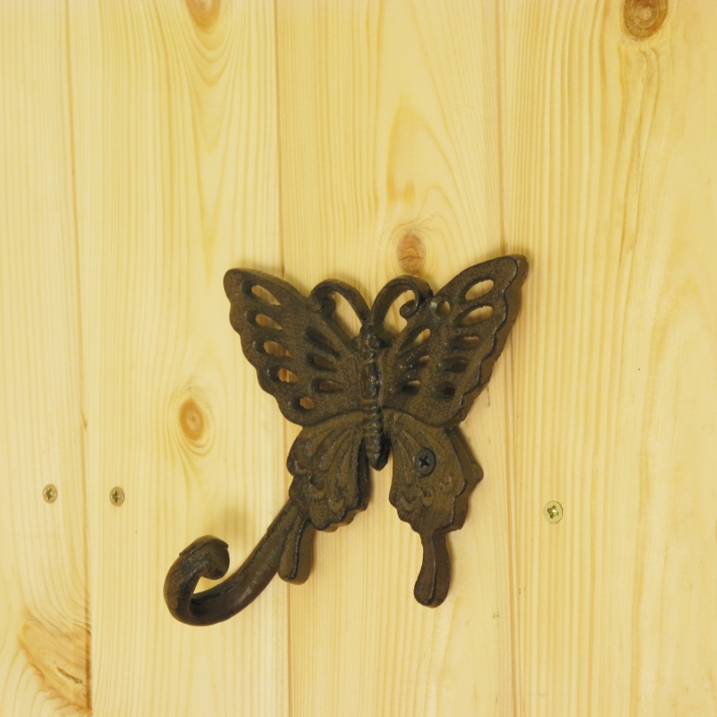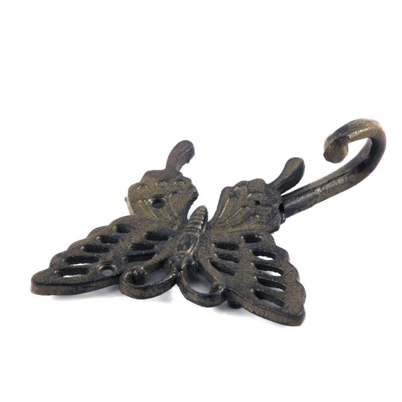 Háčik na zavesenie má rozmery 13,8 x 3,9 x 17,9 cm. Tvarom pripomína jemného motýľa. Vyrobený je však z liatiny, takže bude dostatočne odolný napr. voči nepriazni počasia, a znesie aj väčšie zaťaženie.