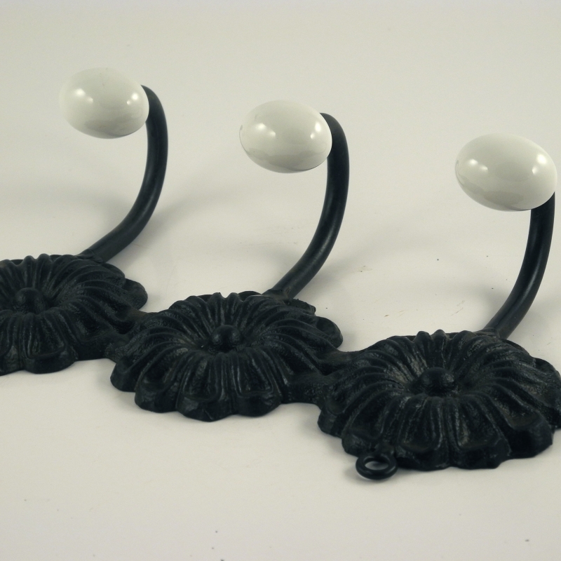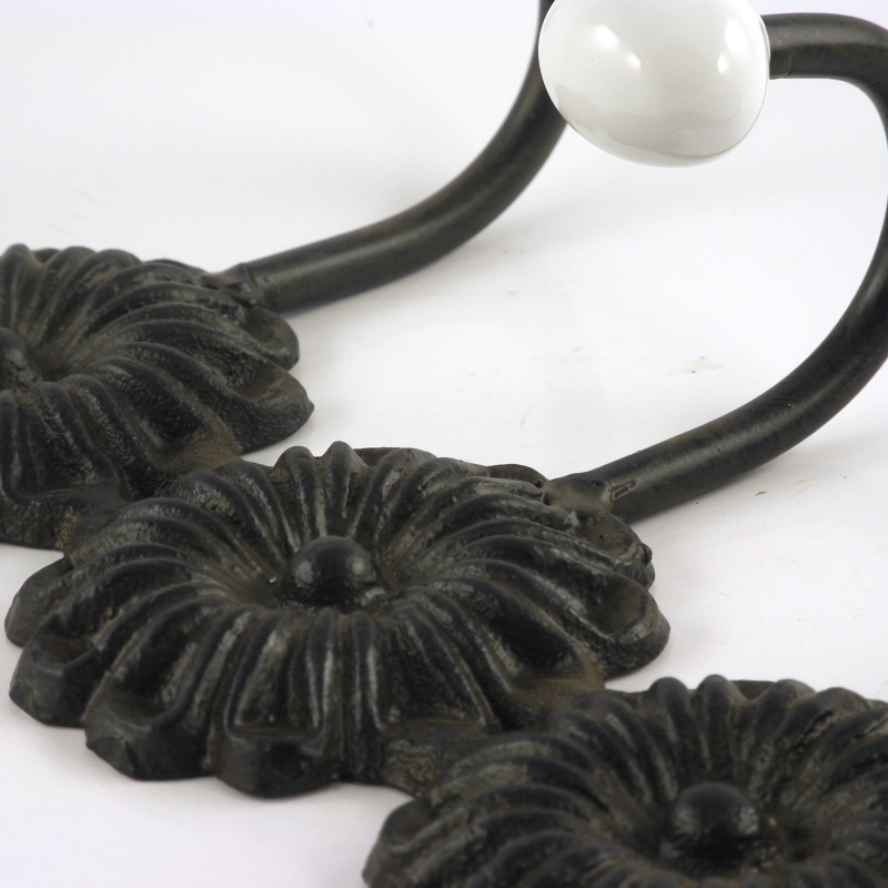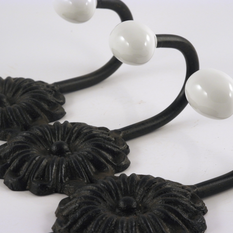 Háčiky do kuchyne na zavesenie všetkého možného i nemožného dodávame s rozmerom 24 x 8 x 16 cm. Na výrobu tříháčku bola použitá kvalitná a odolná liatina. Konce jednotlivých háčikov sú opatrené porcelánovými guličkami, takže nedôjde k poškodeniu zavesených predmetov. Jednotlivé háčiky sú ozdobené liatinovými kvetinkami. Zavesíte ho pomocou dvoch skrutiek.
