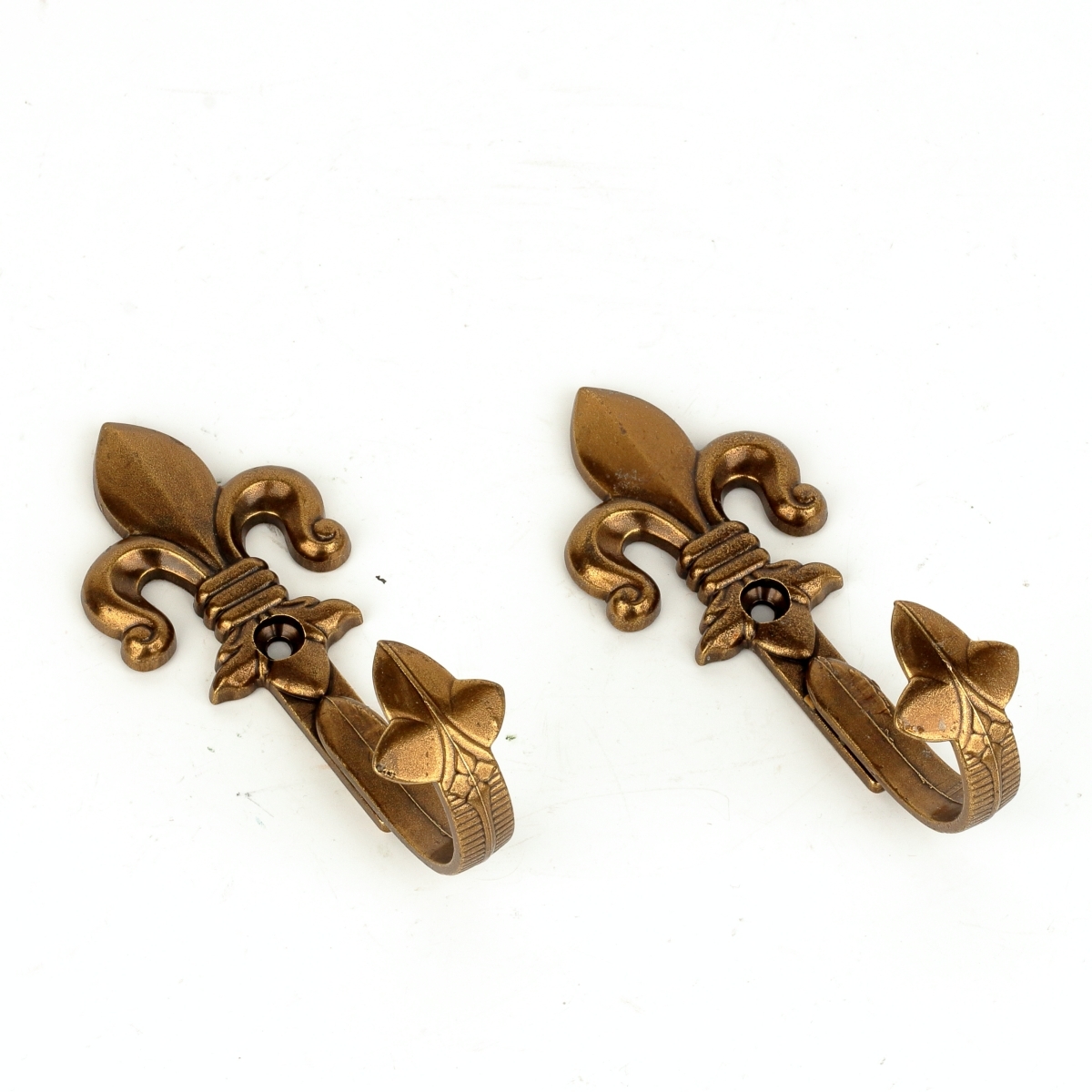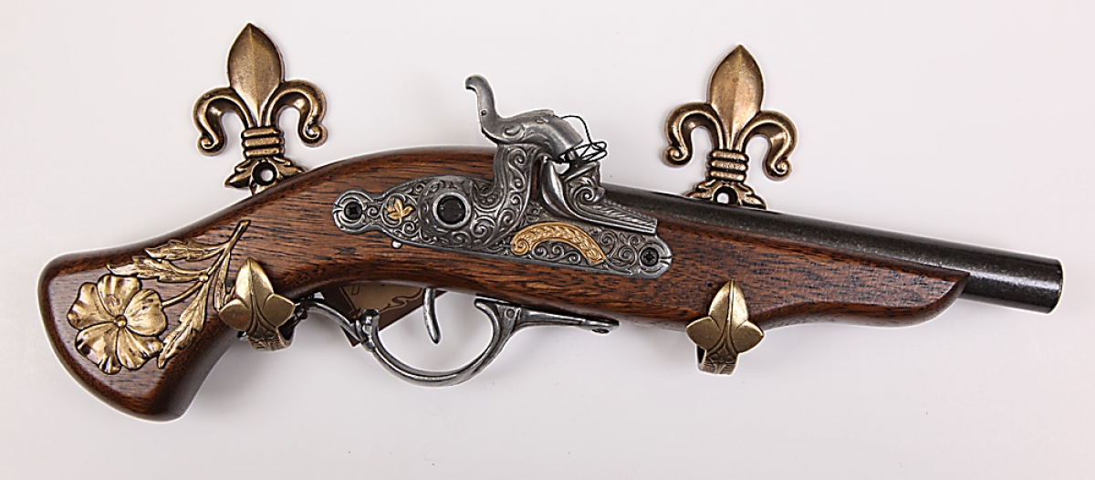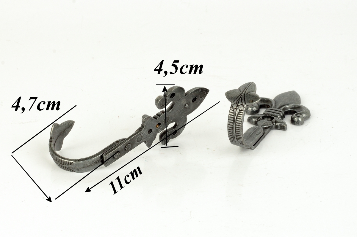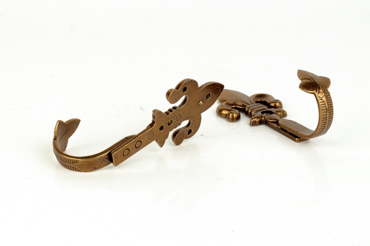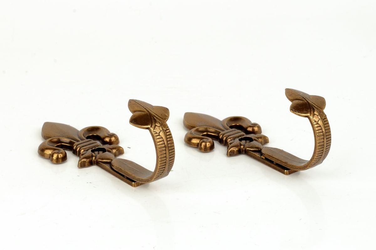 Súprava dvoch zdobných háčikov na pištole, z kovu bronzovej farby, ktorá je primárne určená na upevnenie historických replík týchto zbraní na stenu. Ich tvar vychádza z vzorov s rastlinnou tematikou. Zberateľom týchto predmetov sa určite budú hodiť. Vďaka nim si môžu zo svojej zbierky pištolí vytvoriť peknú inštaláciu na stene a už sa len kochať.