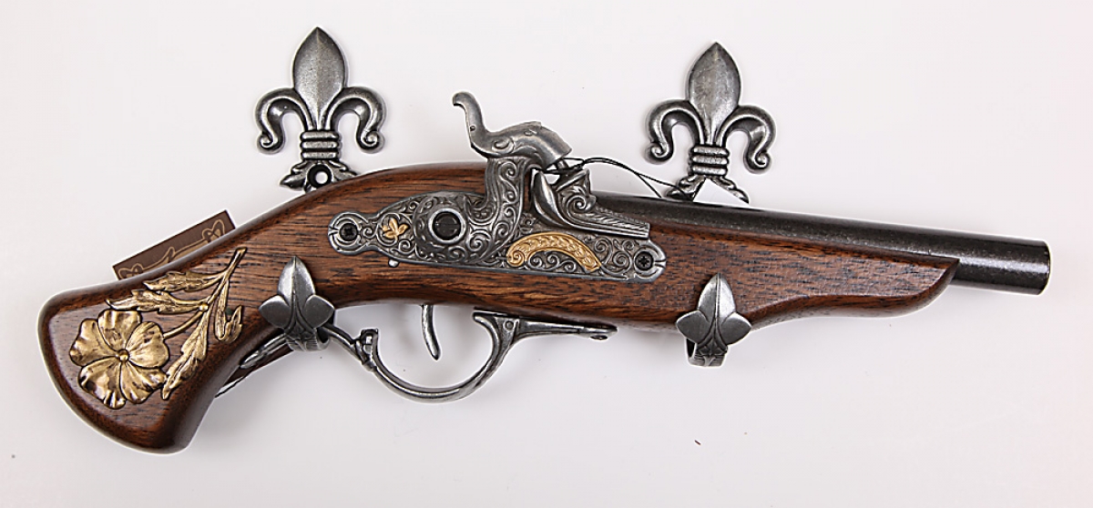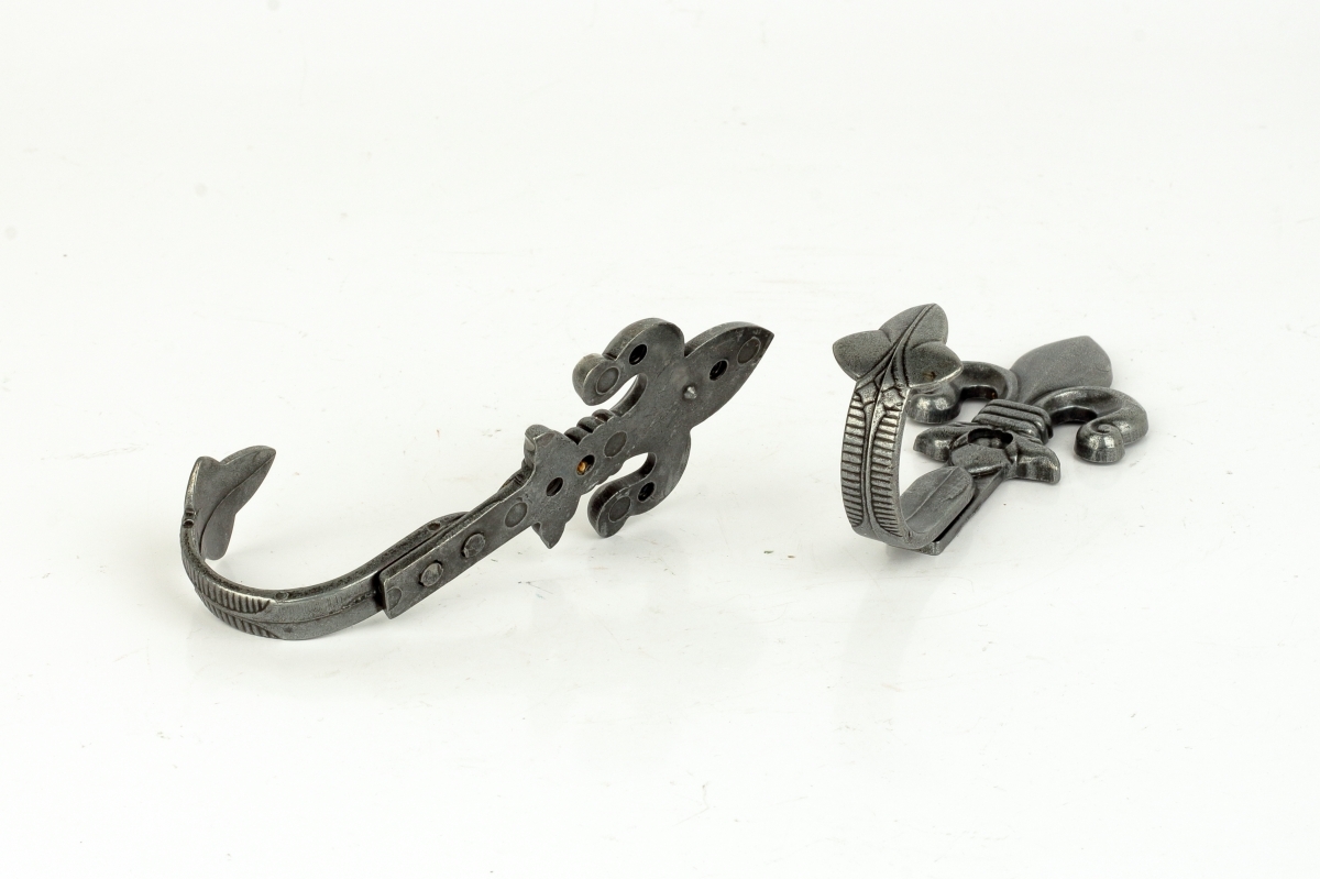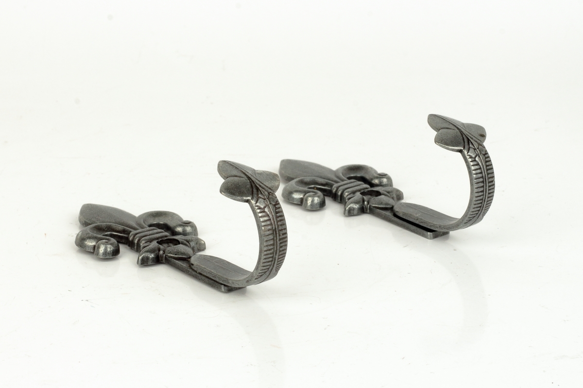 Tieto dva ornamentálne poňaté háčiky na pištole slúžia na upevnenie týchto historických zbraní na stenu. Vďaka nim si budete môcť svoju zbierku zbraní vystaviť tak, kde sa nimi budete môcť kochať.