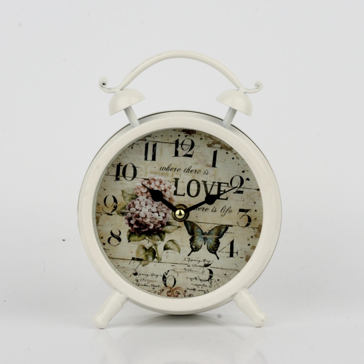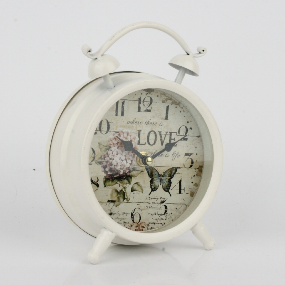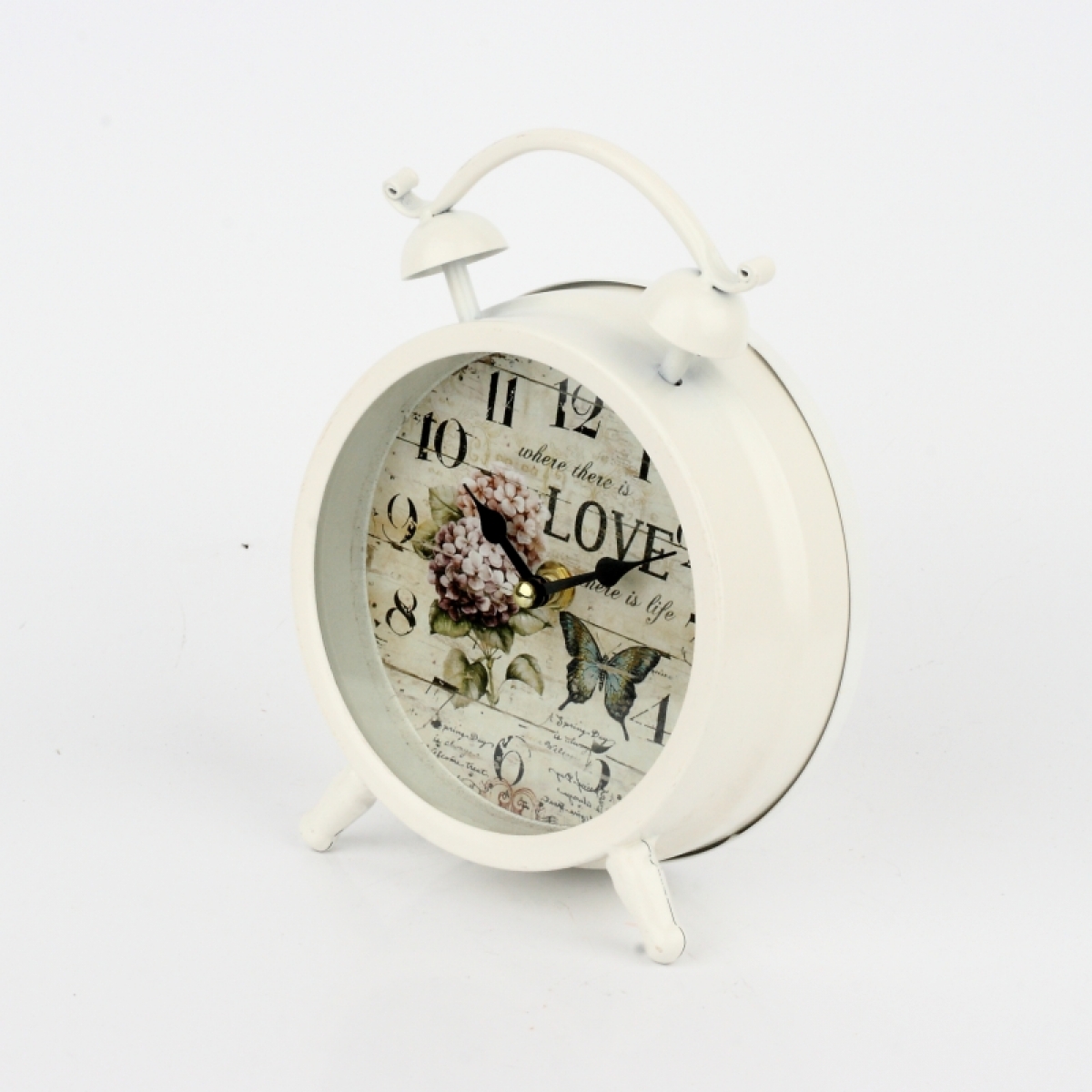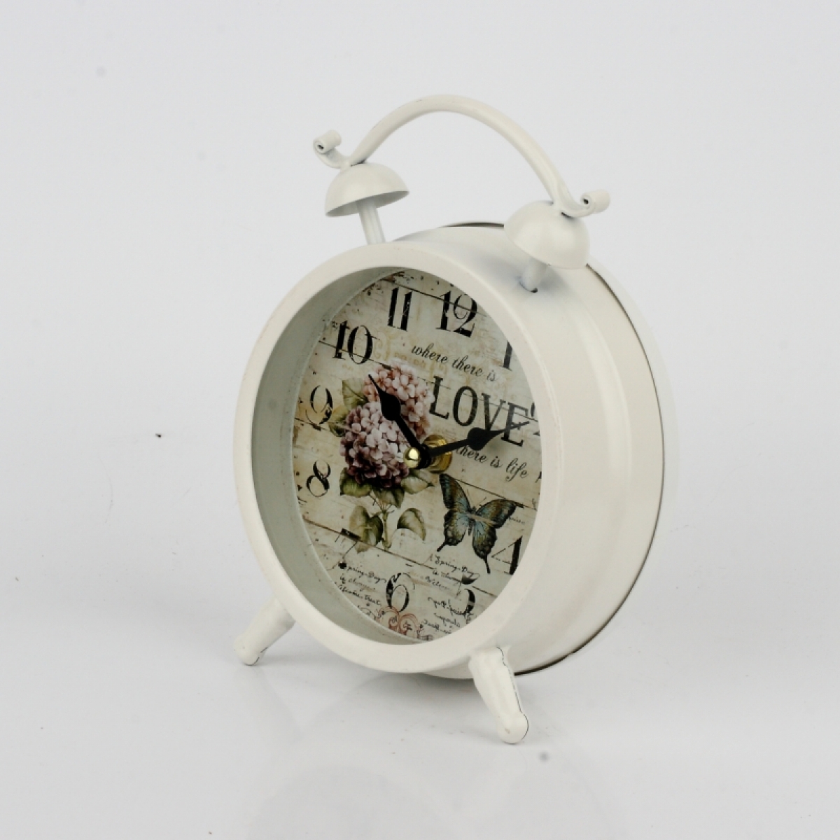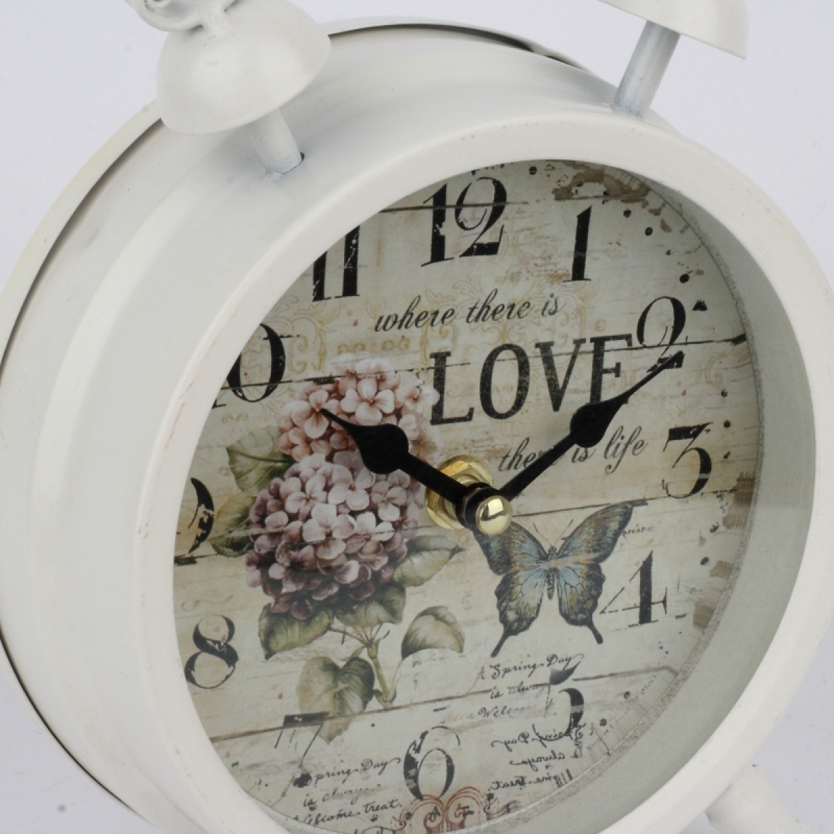 Stolové hodiny v tvare budíka (nezvoní) majú zdobený ciferník s otlčeným vzhľadom, ktorý im dodáva na kráse.