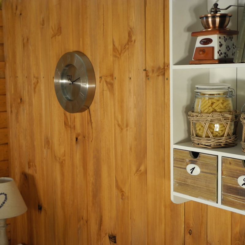 Hodiny do kuchyne na obrázku majú guľatý tvar.